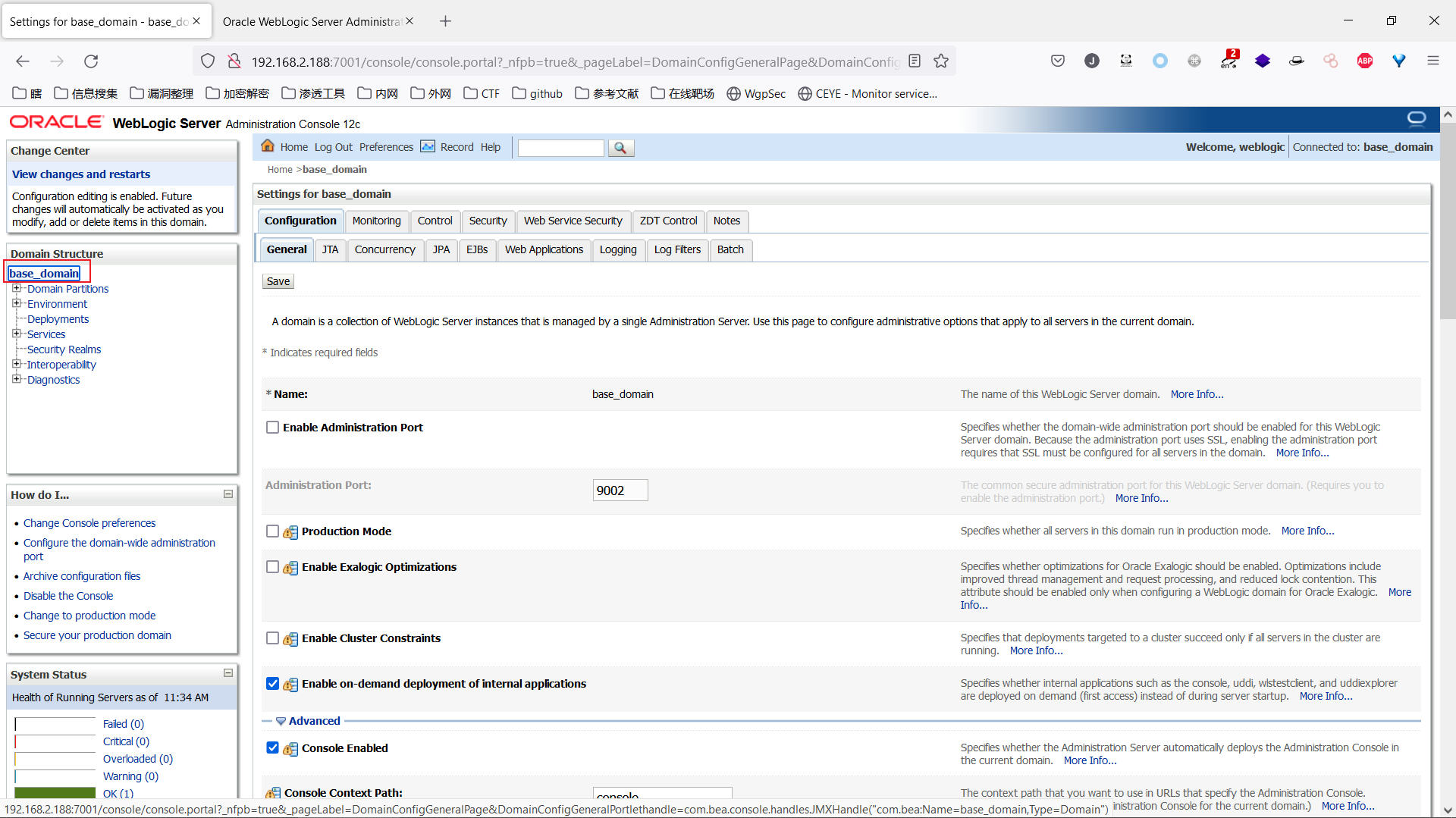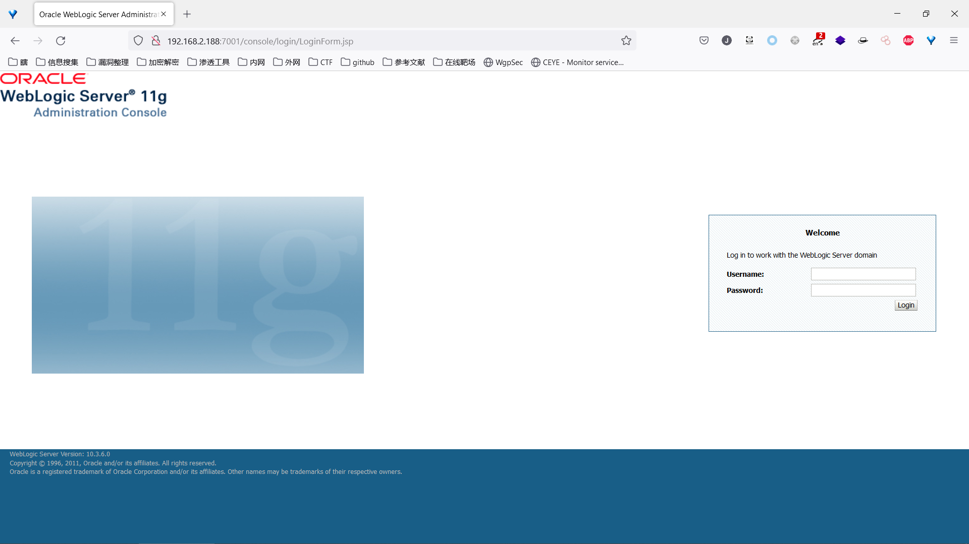 http://192.168.2.188:7001/console/login/LoginForm.jsp登录后台管理员用户名为weblogic点击