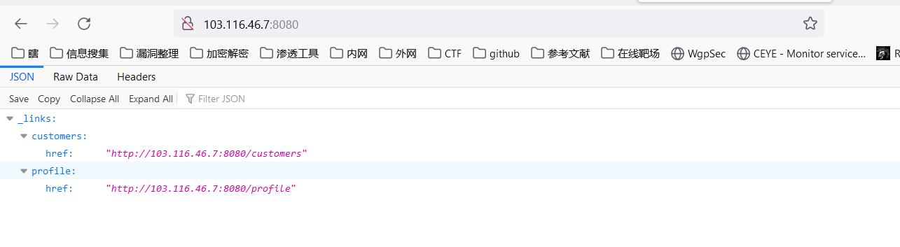 - 访问 - http://103.116.46.7:8080/能够查看json格式的返回值,说明这是一个Restful风格的API服务器.