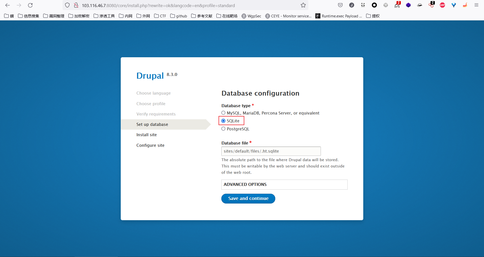环境启动后,访问 http://103.116.46.7:8081/ 将会看到drupal的安装页面,一路默认配置下一步安装.因为没有mysql环境,所以安装的时候可以选择sqlite数据库(参考CVE-2017-6920)