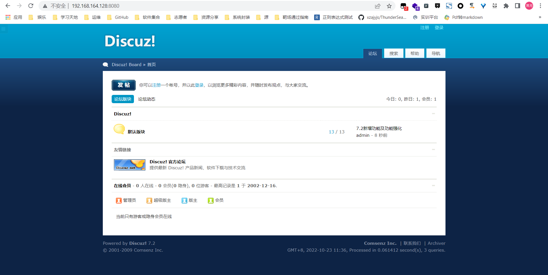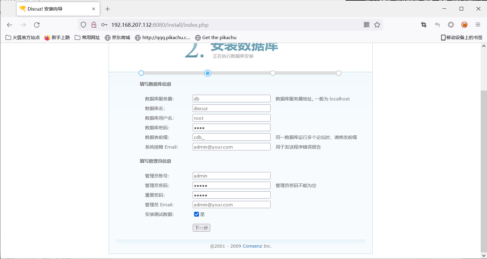 http://192.168.164.128:8080/install/数据库地址填写db,数据库名为discuz,数据库账号密码均为root.