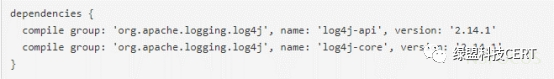 若程序使用gradle打包,可查看build.gradle编译配置文件,若在dependencies部分存在org.apache.logging.log4j相关字段,且版本号为小于2.15.1,则应用受漏洞影响.