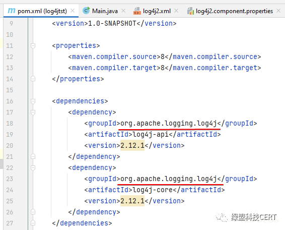 若程序使用Maven打包,可查看项目的pom.xml文件中是否存在下图所示的相关字段,若版本号为小于2.15.1,则应用受漏洞影响.