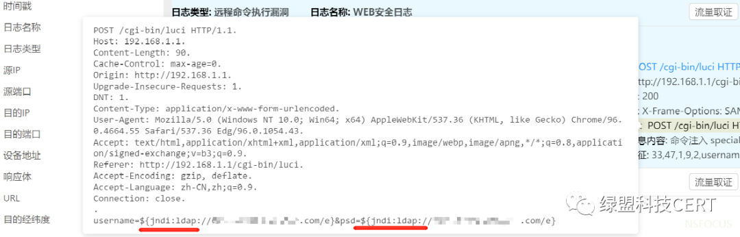 攻击者发送的数据包中可能存在”${jndi:}” 字样,推荐使用全流量或WAF设备进行检索排查.