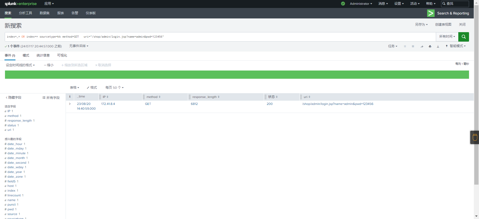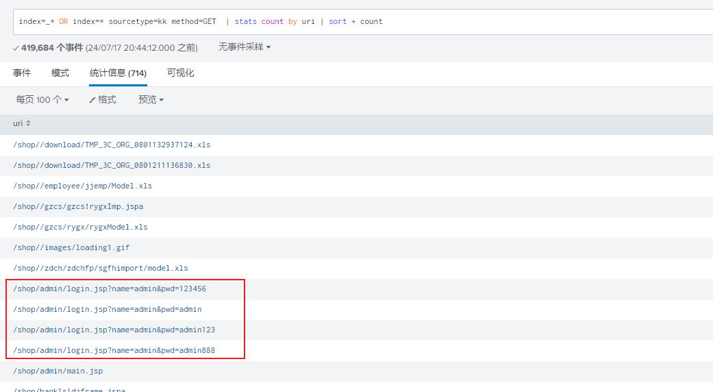 快速浏览,没什么东西使用语句sourcetype=kk method=GET | stats count by uri | sort + count可以发现在暴力破解