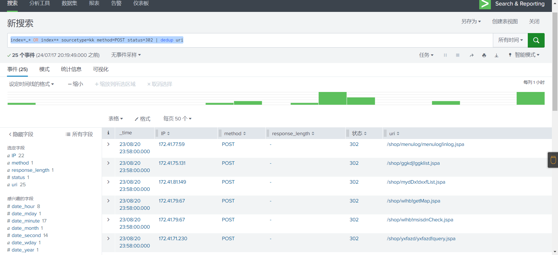 将近1000条数据,上传到splunk中进行分析