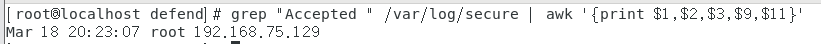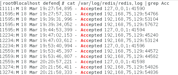 # 查看日志 [root@localhost defend]# cat /var/log/redis/redis.log |grep Acc 11111:M 18 Mar 19:27:54.895 - Accepted 127.0.0.1:41590 11595:M 18 Mar 19:27:57.321 - Accepted 192.168.75.129:54766 11595:M 18 Mar 19:39:31.996 - Accepted 192.168.75.129:53104 11595:M 18 Mar 19:39:34.052 - Accepted 192.168.75.129:57672 11595:M 18 Mar 19:44:53.399 - Accepted 127.0.0.1:41594 12234:M 18 Mar 19:47:02.153 - Accepted 192.168.75.129:45240 12234:M 18 Mar 19:47:03.612 - Accepted 192.168.75.129:53124 12234:M 18 Mar 19:53:40.994 - Accepted 127.0.0.1:41596 12559:M 18 Mar 19:53:45.397 - Accepted 192.168.75.129:44572 12559:M 18 Mar 19:53:46.807 - Accepted 192.168.75.129:44582 12559:M 18 Mar 20:20:57.221 - Accepted 127.0.0.1:41598 13274:M 18 Mar 20:21:56.411 - Accepted 192.168.75.129:54826 13274:M 18 Mar 20:21:58.333 - Accepted 192.168.75.129:54836