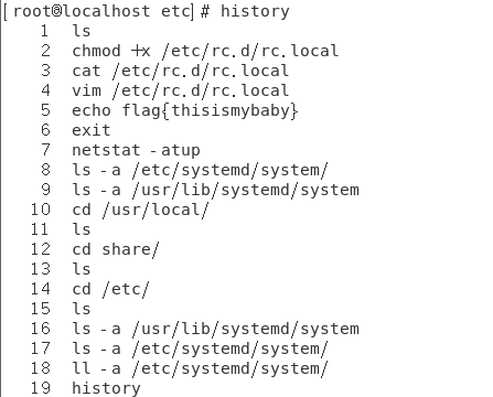 [root@localhost etc]# history ls chmod +x /etc/rc.d/rc.local cat /etc/rc.d/rc.local vim /etc/rc.d/rc.local echo flag{thisismybaby} exit netstat -atup ls -a /etc/systemd/system/ ls -a /usr/lib/systemd/system cd /usr/local/ ls cd share/ ls cd /etc/ ls ls -a /usr/lib/systemd/system ls -a /etc/systemd/system/ ll -a /etc/systemd/system/ history