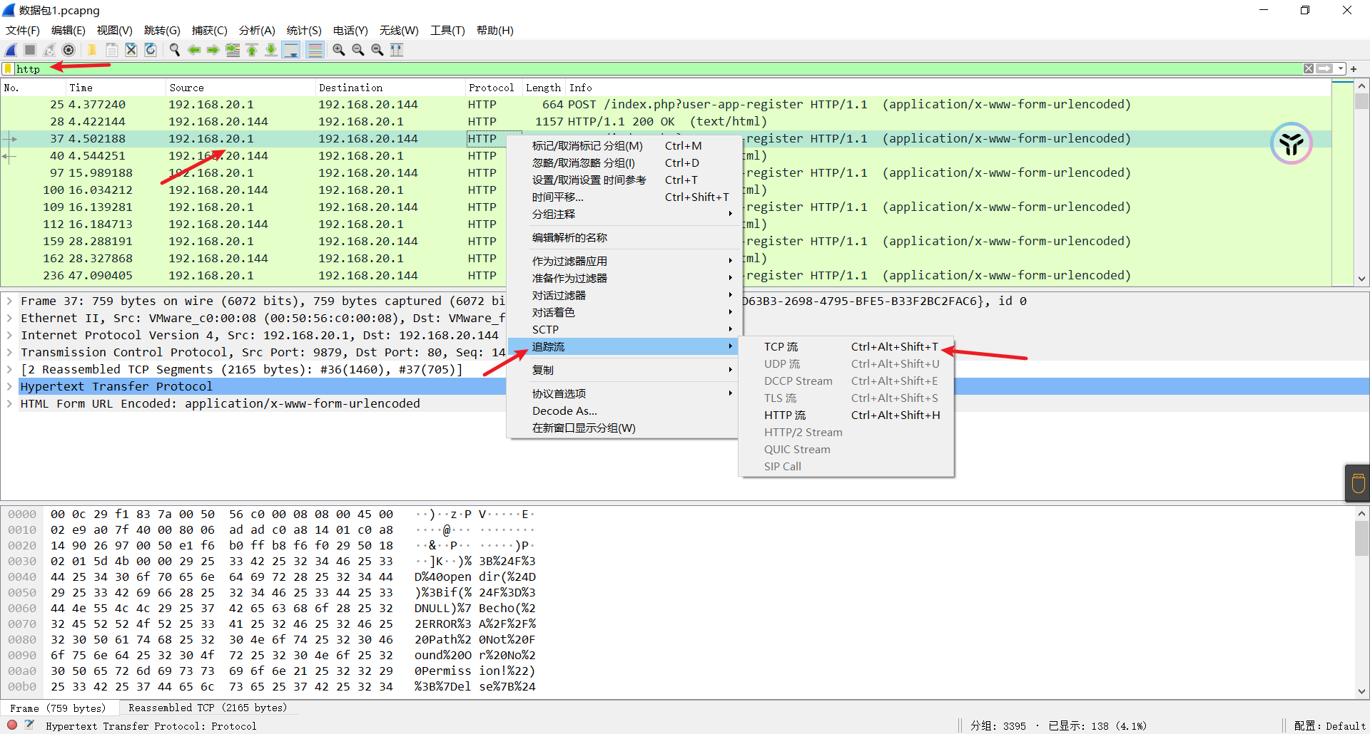 全流量包分析 下载数据包1.pcapng,使用Wireshark分析.在过滤器中输入http随便选中一个流量右键—>追踪流—>TCP流