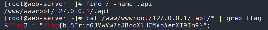 1 2 3 4 [root@web-server ~] /www/wwwroot/127.0.0.1/.api [root@web-server ~] $flag2 = "flag{bL5Frin6JVwVw7tJBdqXlHCMVpAenXI9In9}" ;