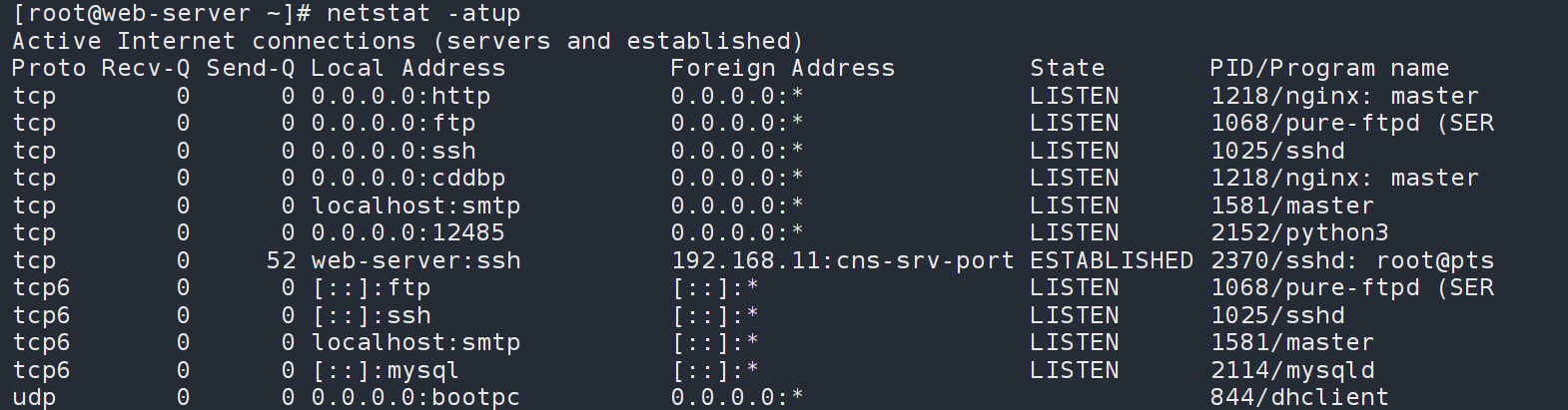 查看端口 1 2 3 4 5 6 7 8 9 10 11 12 13 14 15 16 [root@web-server ~] Active Internet connections (servers and established) Proto Recv-Q Send-Q Local Address Foreign Address State PID/Program name tcp 0 0 0.0.0.0:http 0.0.0.0:* LISTEN 1218/nginx: master tcp 0 0 0.0.0.0:ftp 0.0.0.0:* LISTEN 1068/pure-ftpd (SER tcp 0 0 0.0.0.0:ssh 0.0.0.0:* LISTEN 1025/sshd tcp 0 0 0.0.0.0:cddbp 0.0.0.0:* LISTEN 1218/nginx: master tcp 0 0 localhost:smtp 0.0.0.0:* LISTEN 1581/master tcp 0 0 0.0.0.0:12485 0.0.0.0:* LISTEN 2152/python3 tcp 0 52 web-server:ssh 192.168.11:cns-srv-port ESTABLISHED 2370/sshd: root@pts tcp6 0 0 [::]:ftp [::]:* LISTEN 1068/pure-ftpd (SER tcp6 0 0 [::]:ssh [::]:* LISTEN 1025/sshd tcp6 0 0 localhost:smtp [::]:* LISTEN 1581/master tcp6 0 0 [::]:mysql [::]:* LISTEN 2114/mysqld udp 0 0 0.0.0.0:bootpc 0.0.0.0:* 844/dhclient
