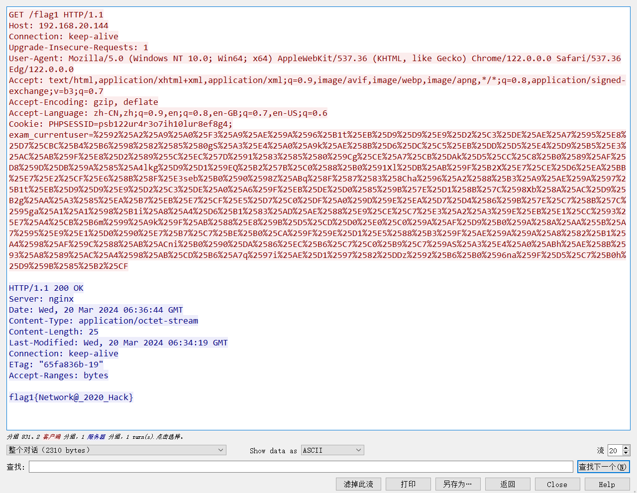 提交数据包中的Flag1 flag1{Network@_2020_Hack}