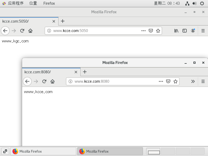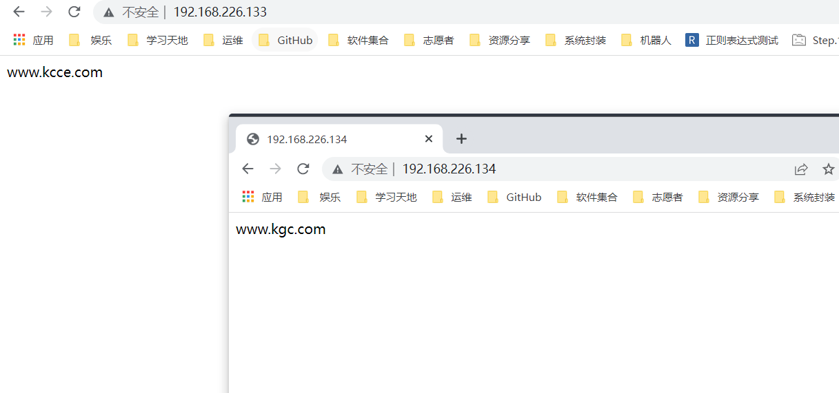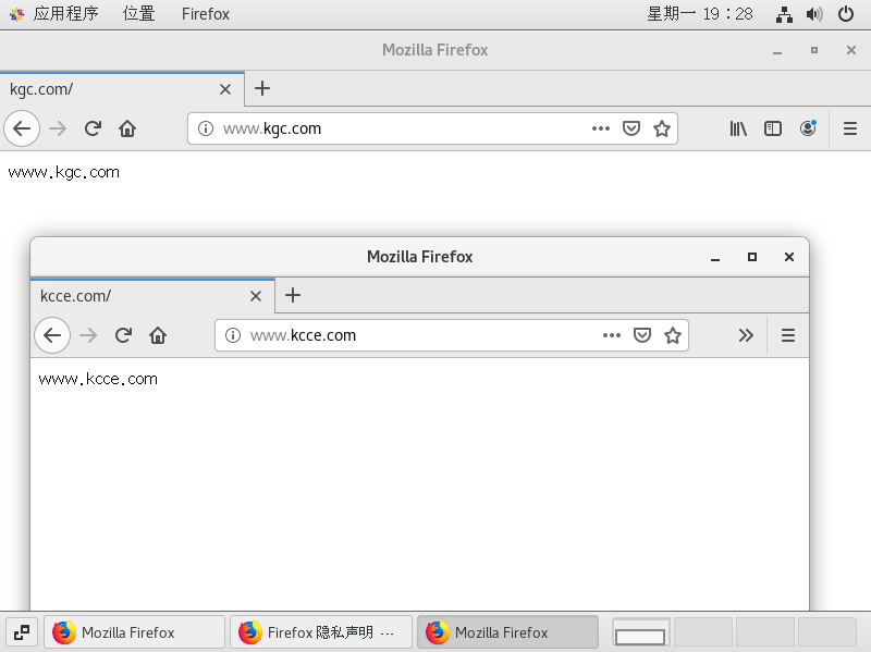 为虚拟主机准备网页文档 1 2 3 mkdir -p /var/www/html/kgccom /var/www/html/kccecomecho " www.kgc.com" > /var/www/html/kgccom/index.htmlecho " www.kcce.com " > /var/www/html/kccecom/index.html
