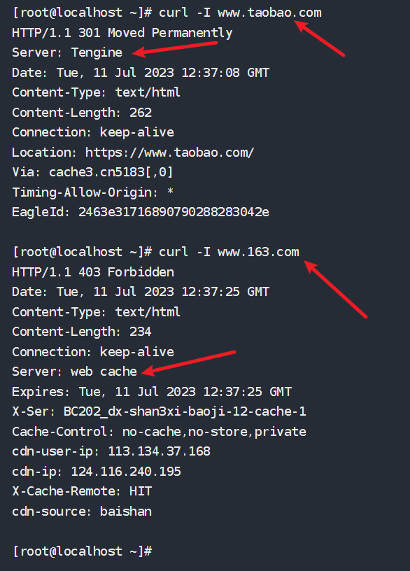 可以使用curl -I (大写i)选项仅查看响应头部信息,我们来看一看国内知名网站部署的服务器类型: