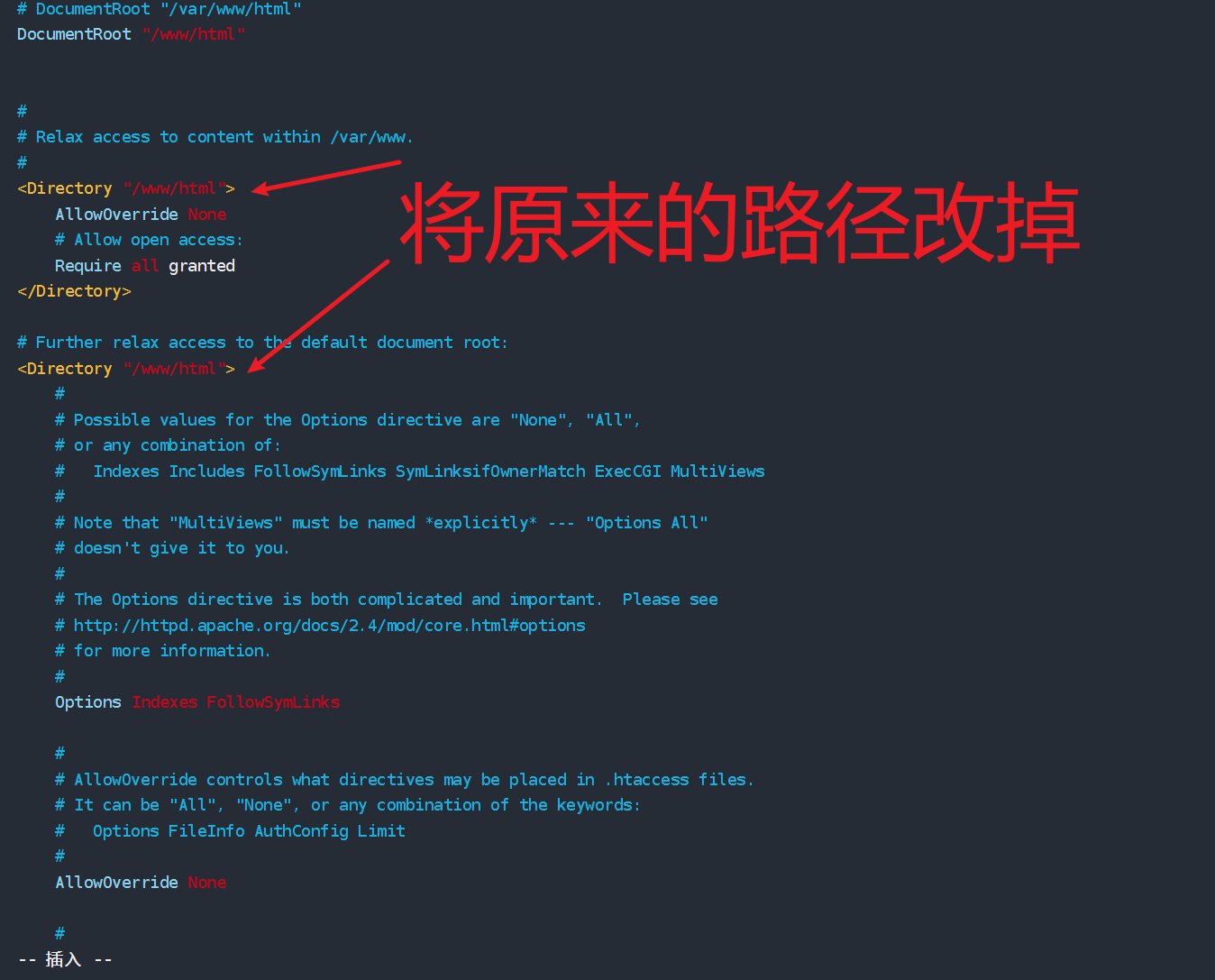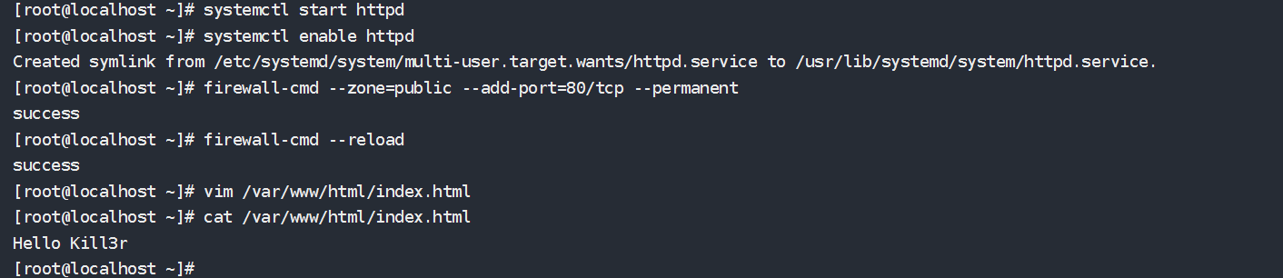修改Apache默认发布目录 1 2 3 4 5 6 7 8 9 10 11 12 mkdir -p /www/htmlchown -R apache:apache /www/htmlchmod -R 755 /www/htmlecho "Hello Kill3r" >> /www/html/index.htmlvim /etc/httpd/conf/httpd.conf DocumentRoot "/www/html" <Directory "/www/html" > Require all granted </Directory>