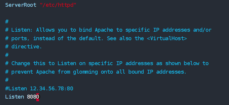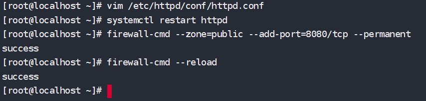 修改默认端口(可选) 1 2 3 4 5 6 7 vim /etc/httpd/conf/httpd.conf systemctl restart httpd firewall-cmd --zone=public --add-port=8080/tcp --permanent firewall-cmd --reload
