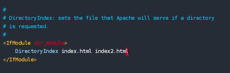 修改默认发布文件 1 2 3 4 5 6 7 8 9 10 vim /etc/httpd/conf/httpd.conf <IfModule dir_module> DirectoryIndex index.html index2.html </IfModule>