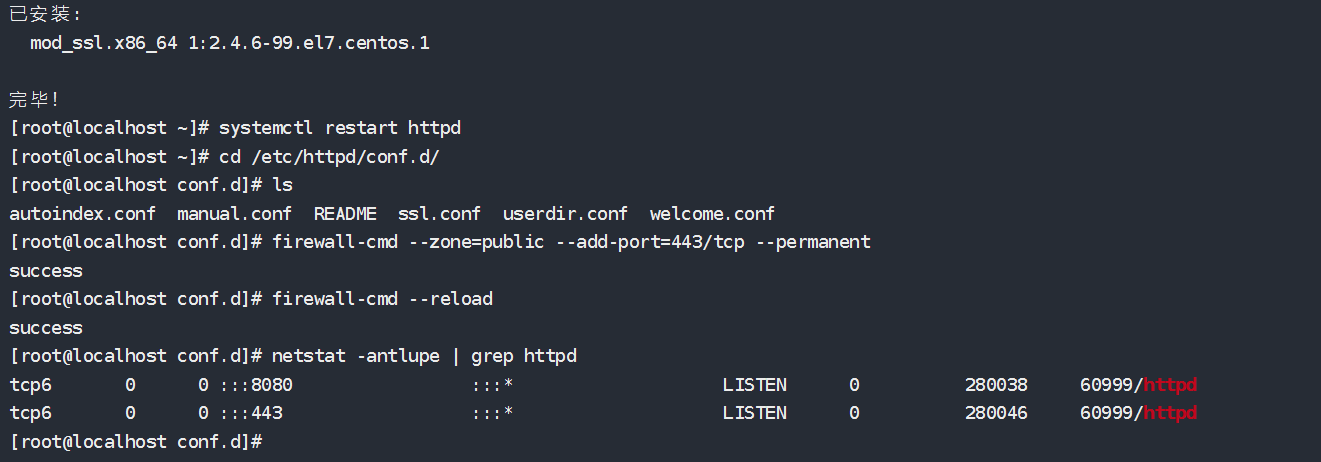 Apache服务加密 1 2 3 4 5 6 7 8 9 10 11 12 13 14 yum install mod_ssl -y systemctl restart httpd cd /etc/httpd/conf.d/ ls firewall-cmd --zone=public --add-port=443/tcp --permanent firewall-cmd --reload netstat -antlupe | grep httpd