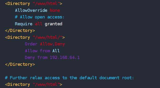 Apache的访问控制 基于IP的访问控制 1 2 3 4 5 6 7 8 9 10 11 12 13 14 15 16 17 18 19 20 21 22 23 24 25 26 27 28 yum remove -y httpd* rm -rf /etc/httpdrm -rf /etc/httpd/conf.d/welcome.confvim /etc/httpd/conf/httpd.conf `以下两个二选一` `Apache的默认配置并不支持使用CIDR表示法或正则表达式进行IP地址的拒绝.如果希望使用更高级的IP拒绝规则,你可能需要考虑使用专门的防火墙软件或其他网络设备来处理这些规则.` <Directory "/www/html/" > Order Allow,Deny Allow from All Deny from 192.168.0.100 </Directory> <Directory "/www/html" > Options Indexes FollowSymLinks Require ip 192.168.64.1 </Directory> systemctl restart httpd