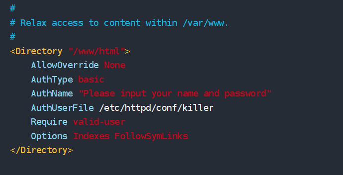 基于用户的访问控制 1 2 3 4 5 6 7 8 9 10 11 12 13 14 15 16 17 18 19 20 21 22 23 24 25 26 27 28 29 30 31 32 33 34 35 36 37 cd /etc/httpd/conf/htpasswd -cm killer killer cat killer vim httpd.conf <Directory "/www/html" > AllowOverride None AuthType basic AuthName "Please input your name and password" AuthUserFile /etc/httpd/conf/killer Require valid-user Options Indexes FollowSymLinks </Directory> systemctl restart httpd.service