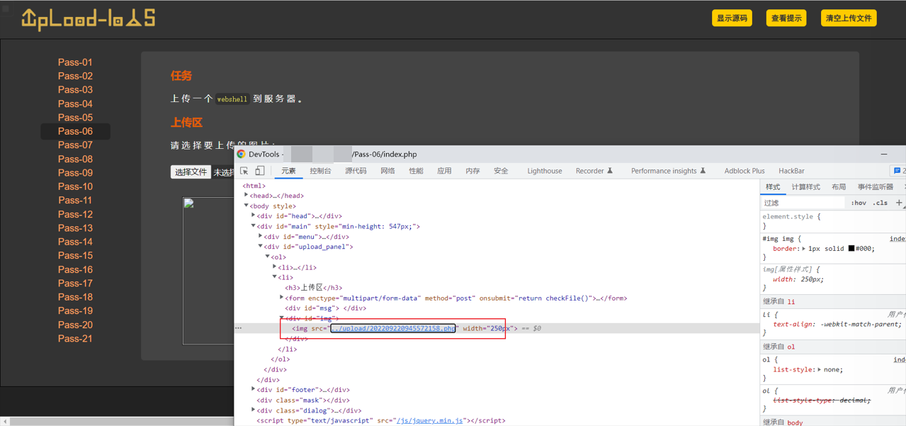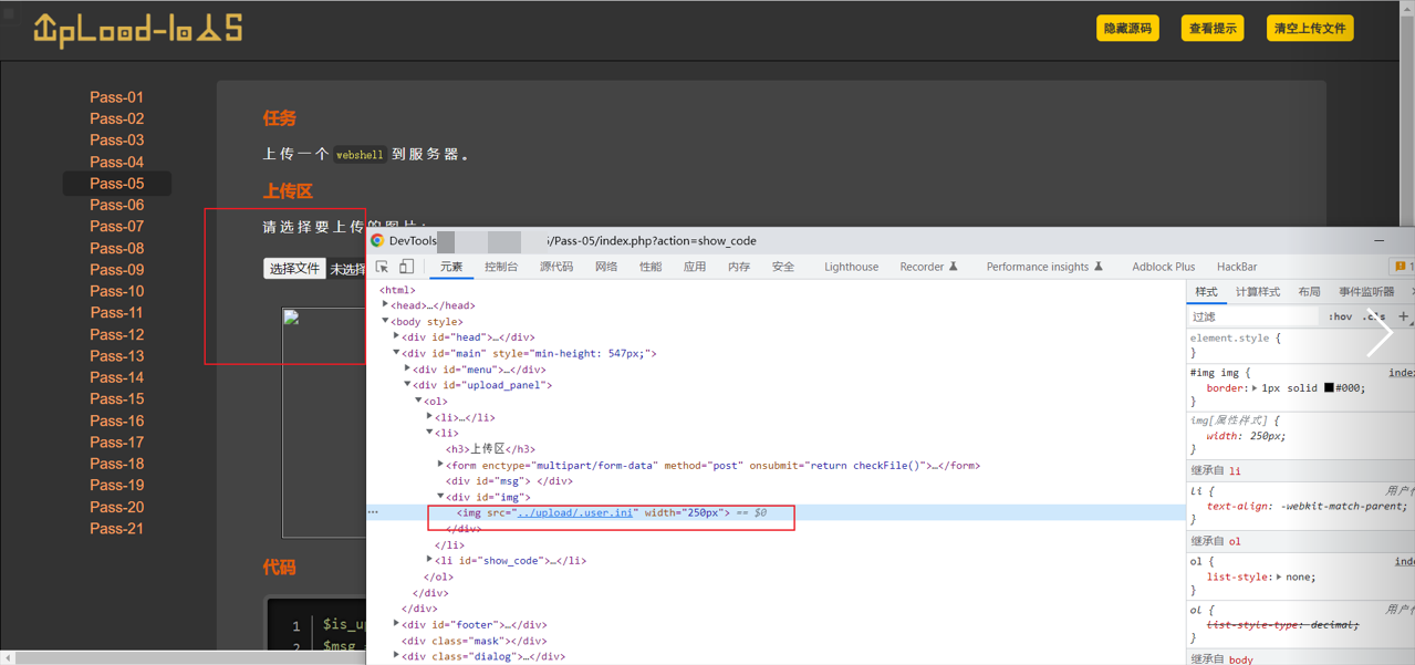 第五关.user.ini绕过 代码分析 通过查看提示和文件源码发现,本pass将.php,.php5,.php4,.php3,.php2,.html,.htm,.phtml,.pht,.pHp,.pHp5,.pHp4,.pHp3,.pHp2,.Html,.Htm,.pHtml,.jsp,.jspa,.jspx,.jsw,.jsv,.jspf,.jtml,.jSp,.jSpx,.jSpa,.jSw,.jSv,.jSpf,.jHtml,.asp,.aspx,.asa,.asax,.ascx,.ashx,.asmx,.cer,.aSp,.aSpx,.aSa,.aSax,.aScx,.aShx,.aSmx,.cEr,.sWf,.swf以及.htaccess都过滤了,此处不能和pass04一样的技巧进行上传.htaccess文件进行绕过.