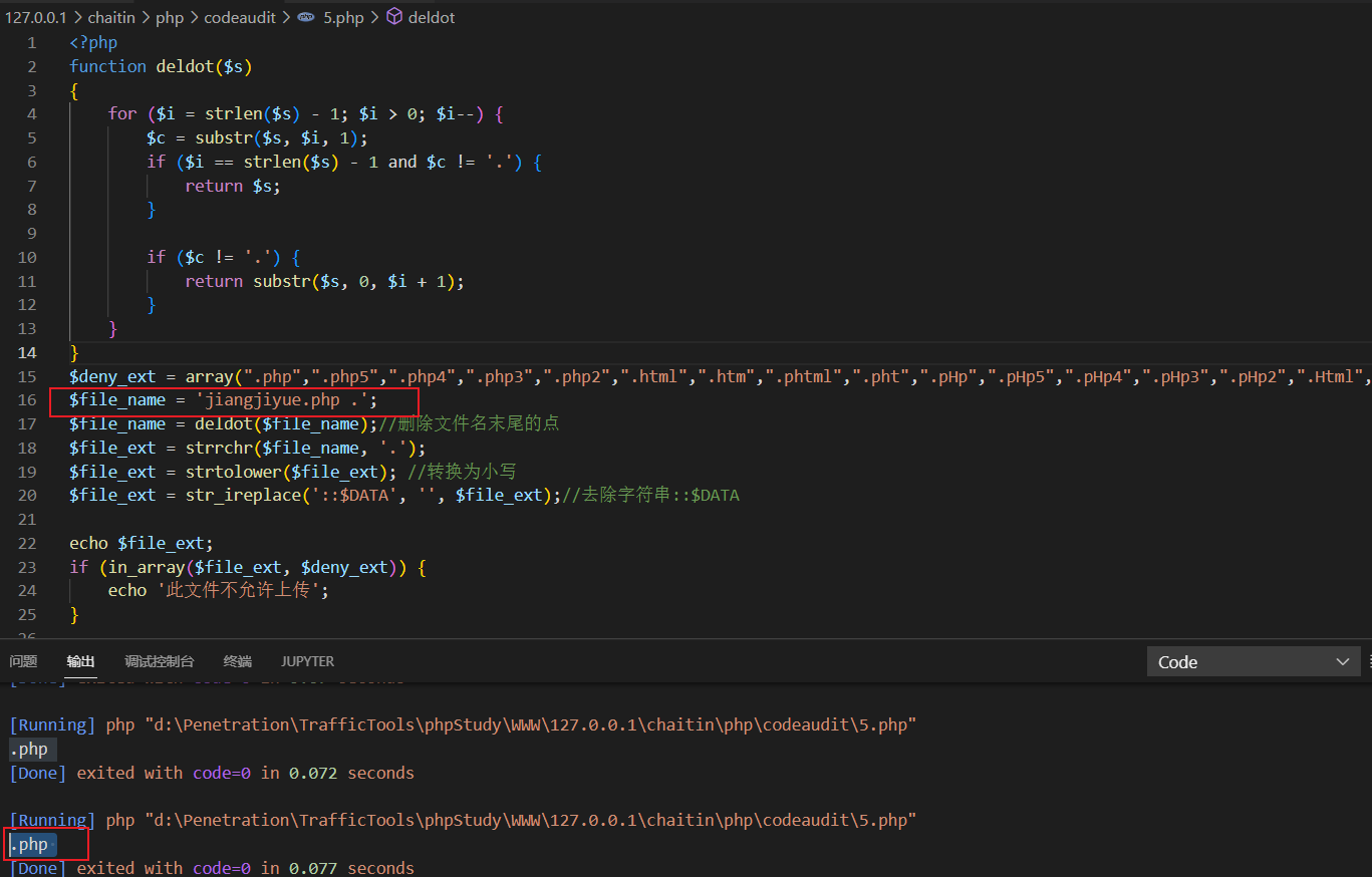1 2 3 4 5 6 7 8 9 10 11 12 13 14 15 16 17 18 19 20 21 22 23 <?php function deldot ($s ) { for ($i = strlen ($s ) - 1 ; $i > 0 ; $i --) { $c = substr ($s , $i , 1 ); if ($i == strlen ($s ) - 1 and $c != '.' ) { return $s ; } if ($c != '.' ) { return substr ($s , 0 , $i + 1 ); } } } $deny_ext = array ("php" ,"php5" ,"php4" ,"php3" ,"php2" ,"html" ,"htm" ,"phtml" ,"pht" ,"jsp" ,"jspa" ,"jspx" ,"jsw" ,"jsv" ,"jspf" ,"jtml" ,"asp" ,"aspx" ,"asa" ,"asax" ,"ascx" ,"ashx" ,"asmx" ,"cer" ,"swf" ,"htaccess" ,"ini" );$file_name = 'jiangjiyue.pphphp' ;$file_name = str_ireplace ($deny_ext ,"" , $file_name );echo '后缀名:' .$file_name ;