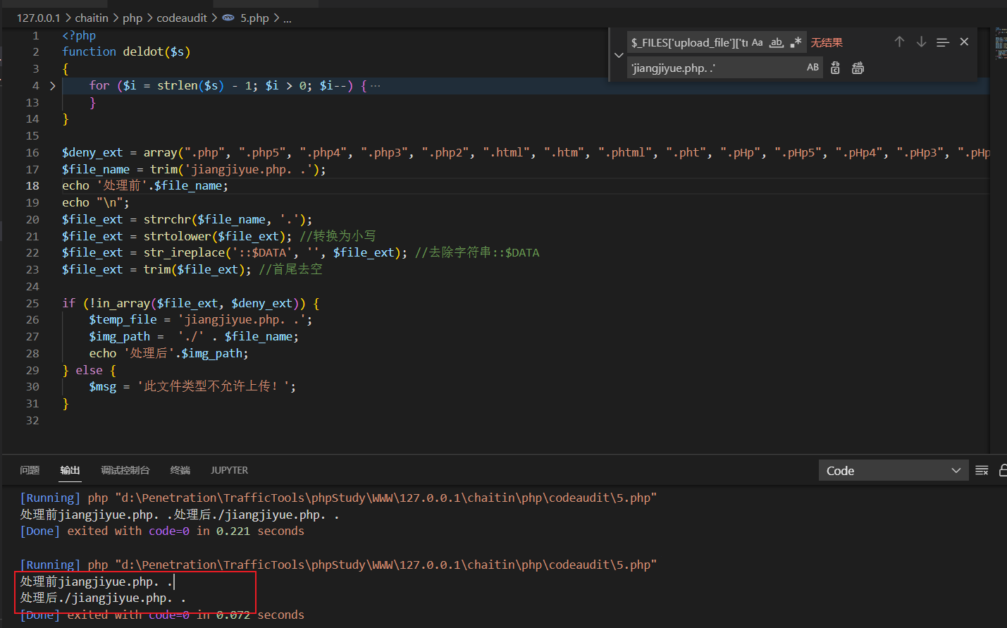1 2 3 4 5 6 7 8 9 10 11 12 13 14 15 16 17 18 19 20 21 22 23 24 25 26 27 28 29 30 31 32 <?php function deldot ($s ) { for ($i = strlen ($s ) - 1 ; $i > 0 ; $i --) { $c = substr ($s , $i , 1 ); if ($i == strlen ($s ) - 1 and $c != '.' ) { return $s ; } if ($c != '.' ) { return substr ($s , 0 , $i + 1 ); } } } $deny_ext = array (".php" , ".php5" , ".php4" , ".php3" , ".php2" , ".html" , ".htm" , ".phtml" , ".pht" , ".pHp" , ".pHp5" , ".pHp4" , ".pHp3" , ".pHp2" , ".Html" , ".Htm" , ".pHtml" , ".jsp" , ".jspa" , ".jspx" , ".jsw" , ".jsv" , ".jspf" , ".jtml" , ".jSp" , ".jSpx" , ".jSpa" , ".jSw" , ".jSv" , ".jSpf" , ".jHtml" , ".asp" , ".aspx" , ".asa" , ".asax" , ".ascx" , ".ashx" , ".asmx" , ".cer" , ".aSp" , ".aSpx" , ".aSa" , ".aSax" , ".aScx" , ".aShx" , ".aSmx" , ".cEr" , ".sWf" , ".swf" , ".htaccess" , ".ini" );$file_name = trim ('jiangjiyue.php. .' );echo '处理前' .$file_name ;echo "\n" ;$file_ext = strrchr ($file_name , '.' );$file_ext = strtolower ($file_ext ); $file_ext = str_ireplace ('::$DATA' , '' , $file_ext ); $file_ext = trim ($file_ext ); if (!in_array ($file_ext , $deny_ext )) { $temp_file = 'jiangjiyue.php. .' ; $img_path = './' . $file_name ; echo '处理后' .$img_path ; } else { $msg = '此文件类型不允许上传!' ; }