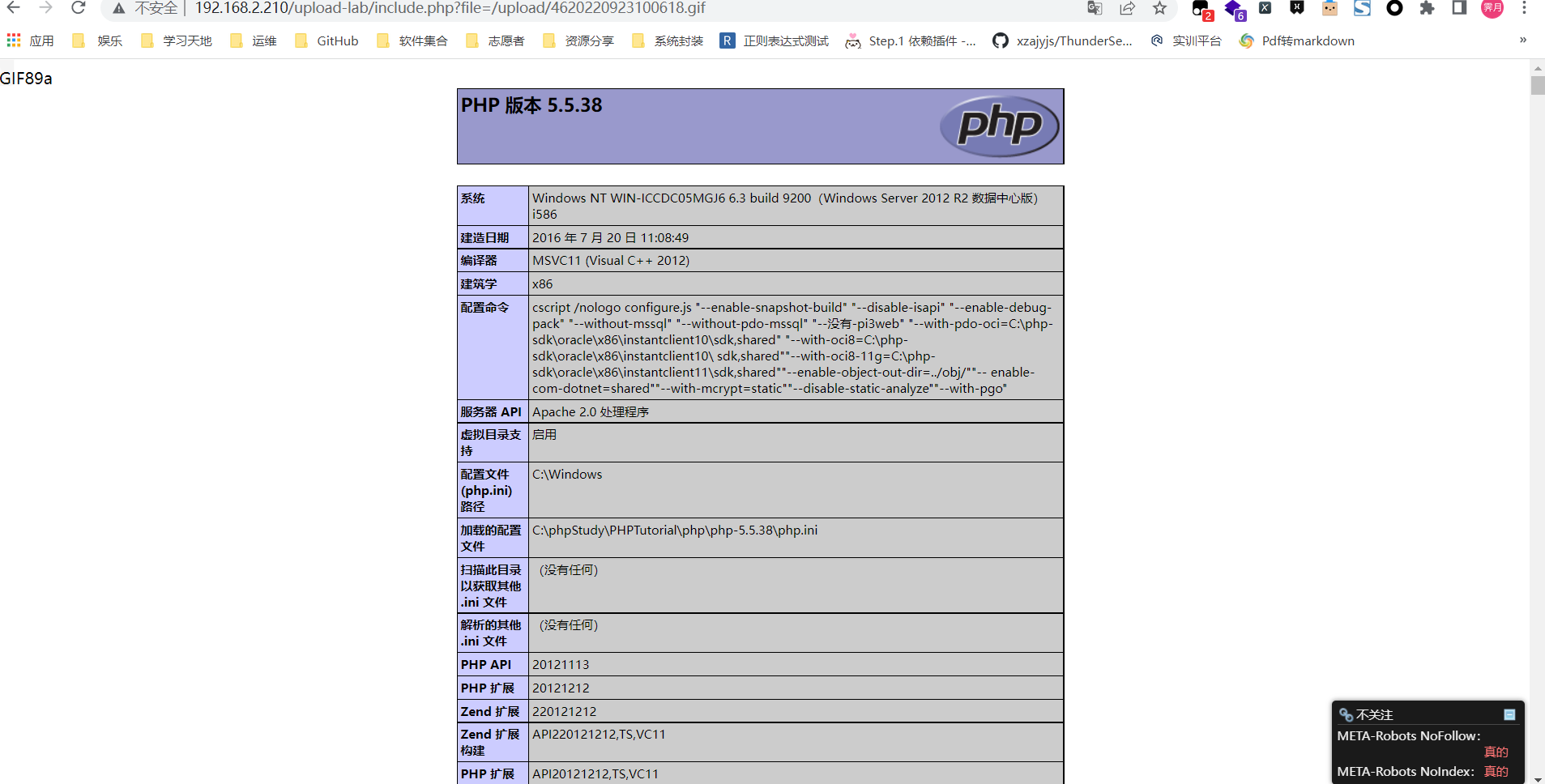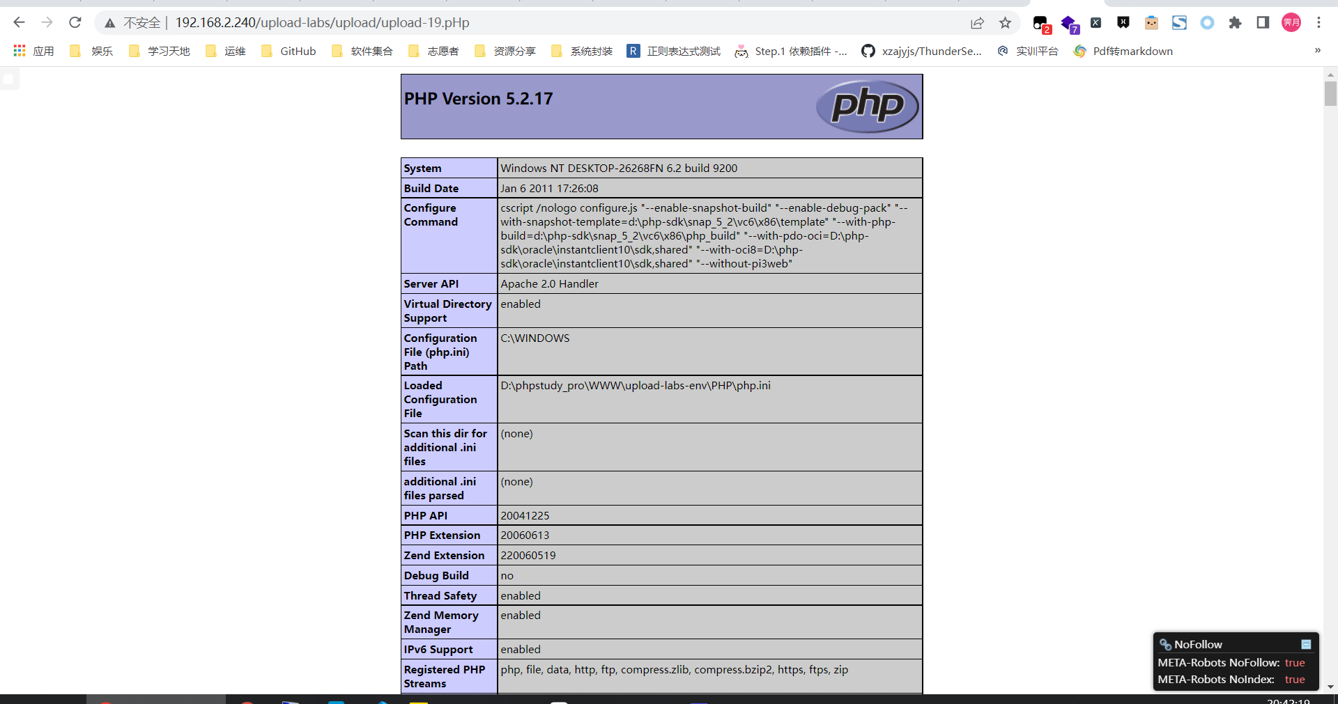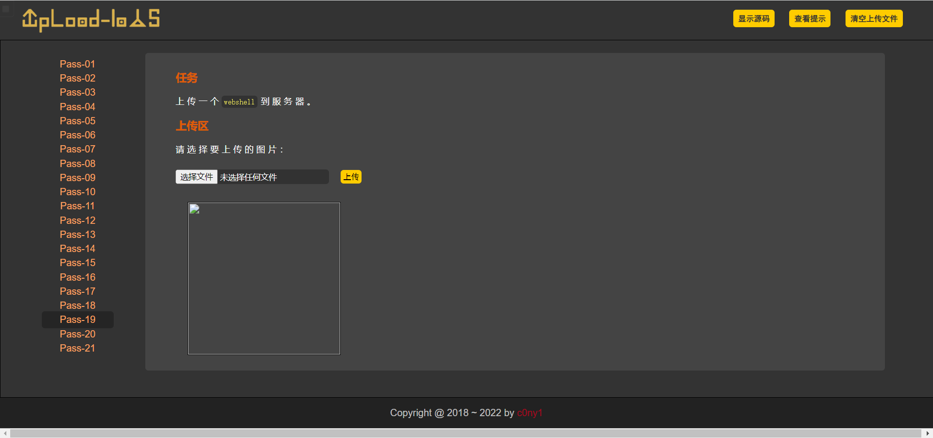 第十九关图片马绕过 代码分析 1 2 3 4 5 6 7 8 9 10 11 12 13 14 15 16 17 18 19 20 21 22 23 24 25 26 27 28 29 30 31 32 33 34 35 36 37 38 39 40 41 42 43 44 45 46 47 48 49 50 51 52 53 54 55 56 57 58 59 60 61 62 63 64 65 66 67 68 69 70 71 72 73 74 75 76 77 78 79 80 81 82 83 84 85 86 87 88 89 90 91 92 93 94 95 96 97 98 99 100 101 102 103 104 105 106 107 108 109 110 111 112 113 114 115 $is_upload = false ;$msg = null ;if (isset ($_POST ['submit' ])){ require_once ("./myupload.php" ); $imgFileName =time (); $u = new MyUpload ($_FILES ['upload_file' ]['name' ], $_FILES ['upload_file' ]['tmp_name' ], $_FILES ['upload_file' ]['size' ],$imgFileName ); $status_code = $u ->upload (UPLOAD_PATH); switch ($status_code ) { case 1 : $is_upload = true ; $img_path = $u ->cls_upload_dir . $u ->cls_file_rename_to; break ; case 2 : $msg = '文件已经被上传,但没有重命名.' ; break ; case -1 : $msg = '这个文件不能上传到服务器的临时文件存储目录.' ; break ; case -2 : $msg = '上传失败,上传目录不可写.' ; break ; case -3 : $msg = '上传失败,无法上传该类型文件.' ; break ; case -4 : $msg = '上传失败,上传的文件过大.' ; break ; case -5 : $msg = '上传失败,服务器已经存在相同名称文件.' ; break ; case -6 : $msg = '文件无法上传,文件不能复制到目标目录.' ; break ; default : $msg = '未知错误!' ; break ; } } class MyUpload {...... ...... ...... var $cls_arr_ext_accepted = array ( ".doc" , ".xls" , ".txt" , ".pdf" , ".gif" , ".jpg" , ".zip" , ".rar" , ".7z" ,".ppt" , ".html" , ".xml" , ".tiff" , ".jpeg" , ".png" ); ...... ...... ...... function upload ( $dir ) { $ret = $this ->isUploadedFile (); if ( $ret != 1 ){ return $this ->resultUpload ( $ret ); } $ret = $this ->setDir ( $dir ); if ( $ret != 1 ){ return $this ->resultUpload ( $ret ); } $ret = $this ->checkExtension (); if ( $ret != 1 ){ return $this ->resultUpload ( $ret ); } $ret = $this ->checkSize (); if ( $ret != 1 ){ return $this ->resultUpload ( $ret ); } if ( $this ->cls_file_exists == 1 ){ $ret = $this ->checkFileExists (); if ( $ret != 1 ){ return $this ->resultUpload ( $ret ); } } $ret = $this ->move (); if ( $ret != 1 ){ return $this ->resultUpload ( $ret ); } if ( $this ->cls_rename_file == 1 ){ $ret = $this ->renameFile (); if ( $ret != 1 ){ return $this ->resultUpload ( $ret ); } } return $this ->resultUpload ( "SUCCESS" ); } };