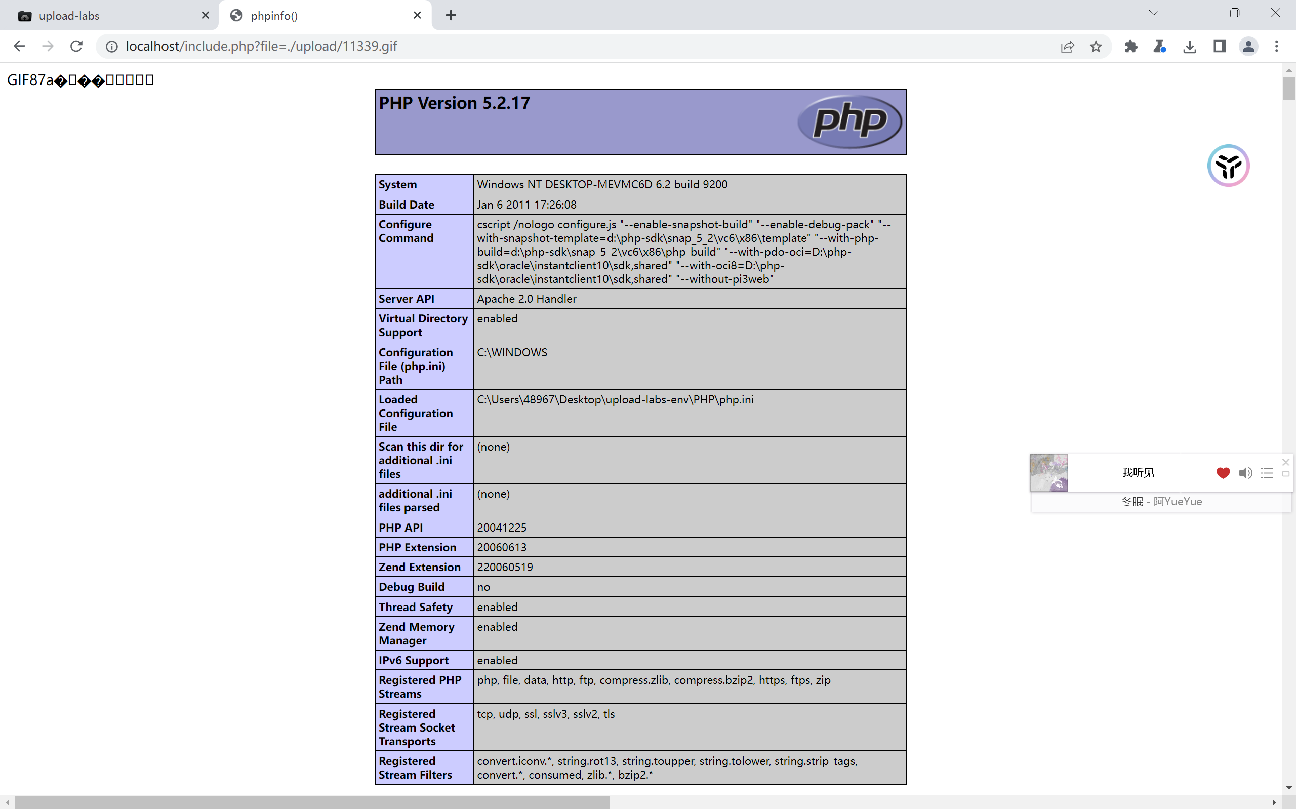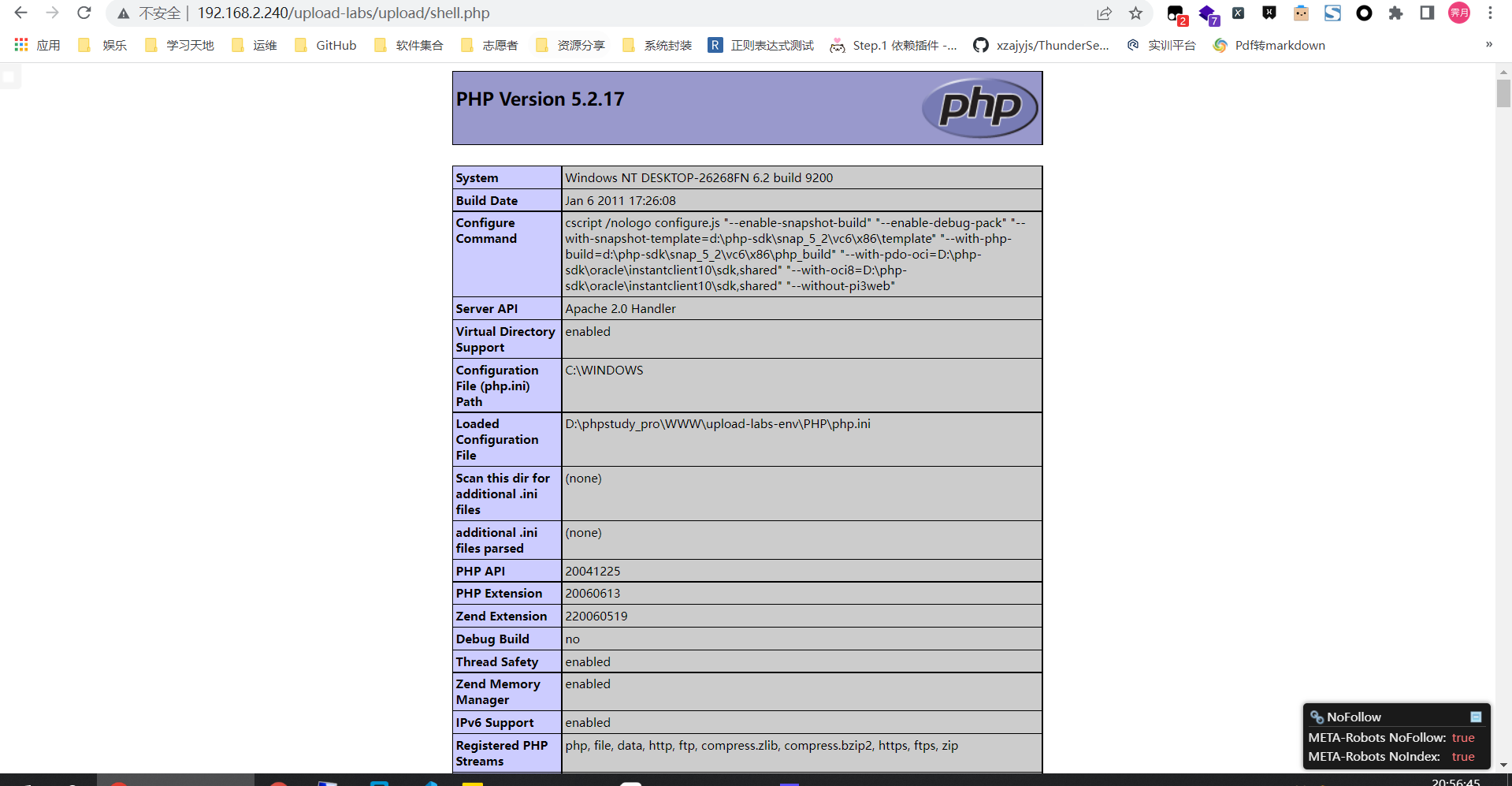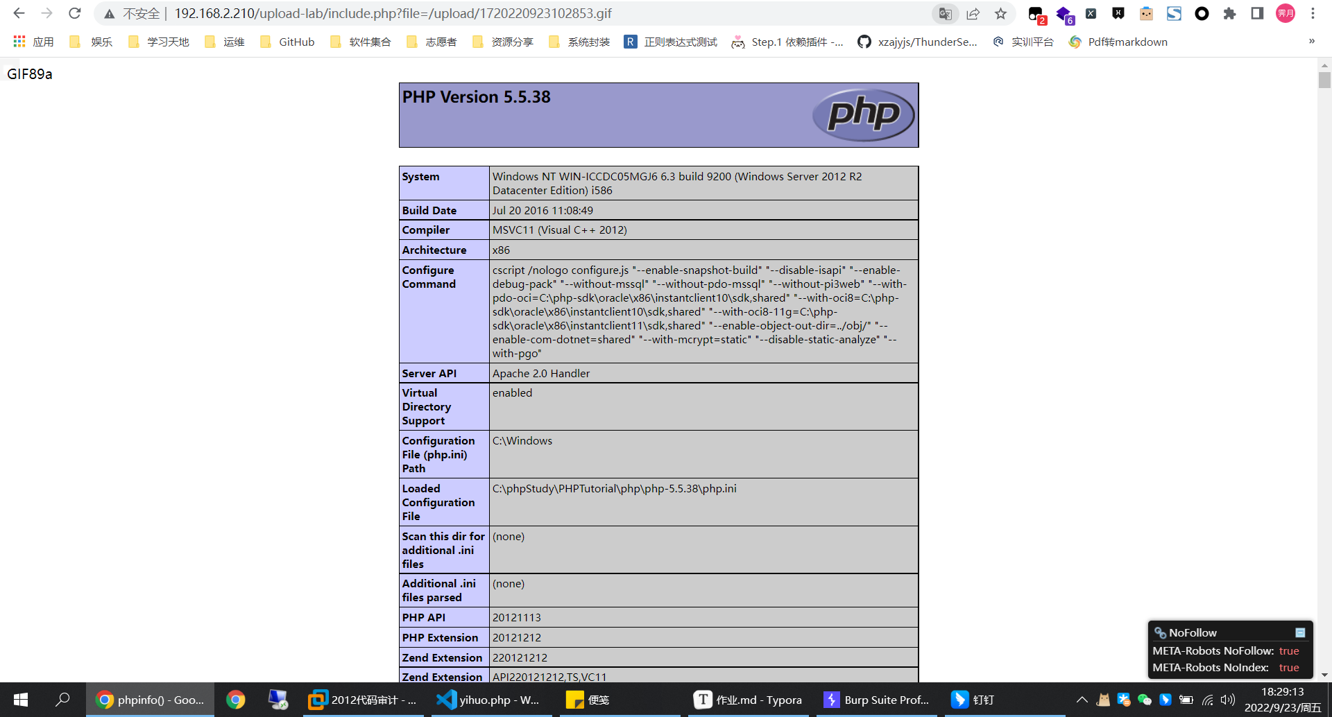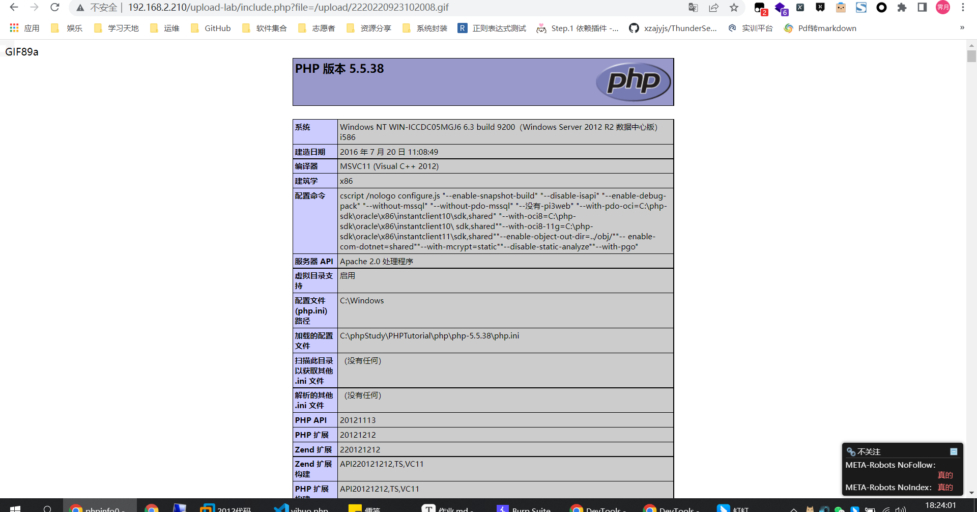 第十九关图片马绕过 代码分析 1 2 3 4 5 6 7 8 9 10 11 12 13 14 15 16 17 18 19 20 21 22 23 24 25 26 27 28 29 30 31 32 33 34 35 36 37 38 39 40 41 42 43 44 45 46 47 48 49 50 51 52 53 54 55 56 57 58 59 60 61 62 63 64 65 66 67 68 69 70 71 72 73 74 75 76 77 78 79 80 81 82 83 84 85 86 87 88 89 90 91 92 93 94 95 96 97 98 99 100 101 102 103 104 105 106 107 108 109 110 111 112 113 114 115 $is_upload = false ;$msg = null ;if (isset ($_POST ['submit' ])){ require_once ("./myupload.php" ); $imgFileName =time (); $u = new MyUpload ($_FILES ['upload_file' ]['name' ], $_FILES ['upload_file' ]['tmp_name' ], $_FILES ['upload_file' ]['size' ],$imgFileName ); $status_code = $u ->upload (UPLOAD_PATH); switch ($status_code ) { case 1 : $is_upload = true ; $img_path = $u ->cls_upload_dir . $u ->cls_file_rename_to; break ; case 2 : $msg = '文件已经被上传,但没有重命名.' ; break ; case -1 : $msg = '这个文件不能上传到服务器的临时文件存储目录.' ; break ; case -2 : $msg = '上传失败,上传目录不可写.' ; break ; case -3 : $msg = '上传失败,无法上传该类型文件.' ; break ; case -4 : $msg = '上传失败,上传的文件过大.' ; break ; case -5 : $msg = '上传失败,服务器已经存在相同名称文件.' ; break ; case -6 : $msg = '文件无法上传,文件不能复制到目标目录.' ; break ; default : $msg = '未知错误!' ; break ; } } class MyUpload {...... ...... ...... var $cls_arr_ext_accepted = array ( ".doc" , ".xls" , ".txt" , ".pdf" , ".gif" , ".jpg" , ".zip" , ".rar" , ".7z" ,".ppt" , ".html" , ".xml" , ".tiff" , ".jpeg" , ".png" ); ...... ...... ...... function upload ( $dir ) { $ret = $this ->isUploadedFile (); if ( $ret != 1 ){ return $this ->resultUpload ( $ret ); } $ret = $this ->setDir ( $dir ); if ( $ret != 1 ){ return $this ->resultUpload ( $ret ); } $ret = $this ->checkExtension (); if ( $ret != 1 ){ return $this ->resultUpload ( $ret ); } $ret = $this ->checkSize (); if ( $ret != 1 ){ return $this ->resultUpload ( $ret ); } if ( $this ->cls_file_exists == 1 ){ $ret = $this ->checkFileExists (); if ( $ret != 1 ){ return $this ->resultUpload ( $ret ); } } $ret = $this ->move (); if ( $ret != 1 ){ return $this ->resultUpload ( $ret ); } if ( $this ->cls_rename_file == 1 ){ $ret = $this ->renameFile (); if ( $ret != 1 ){ return $this ->resultUpload ( $ret ); } } return $this ->resultUpload ( "SUCCESS" ); } };