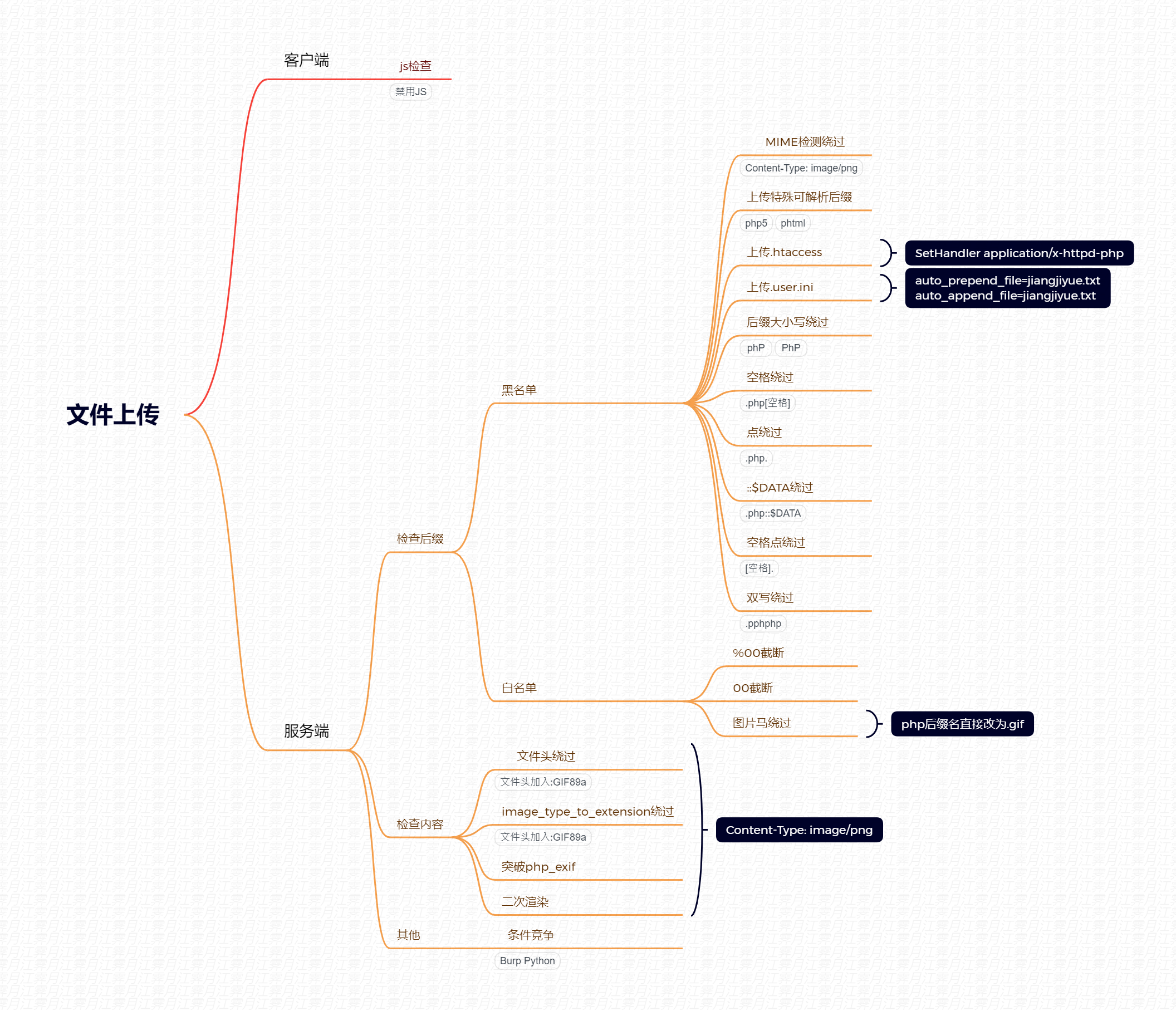 客户端检查和服务器端检查: 在客户端进行检查可以阻挡一些基本的试探,服务器端检查最好采用白名单过滤的方式,防止绕过大小写等方式进行攻击.同时对 %00 截断符和 HTTP 包头的 content-type 进行检查.